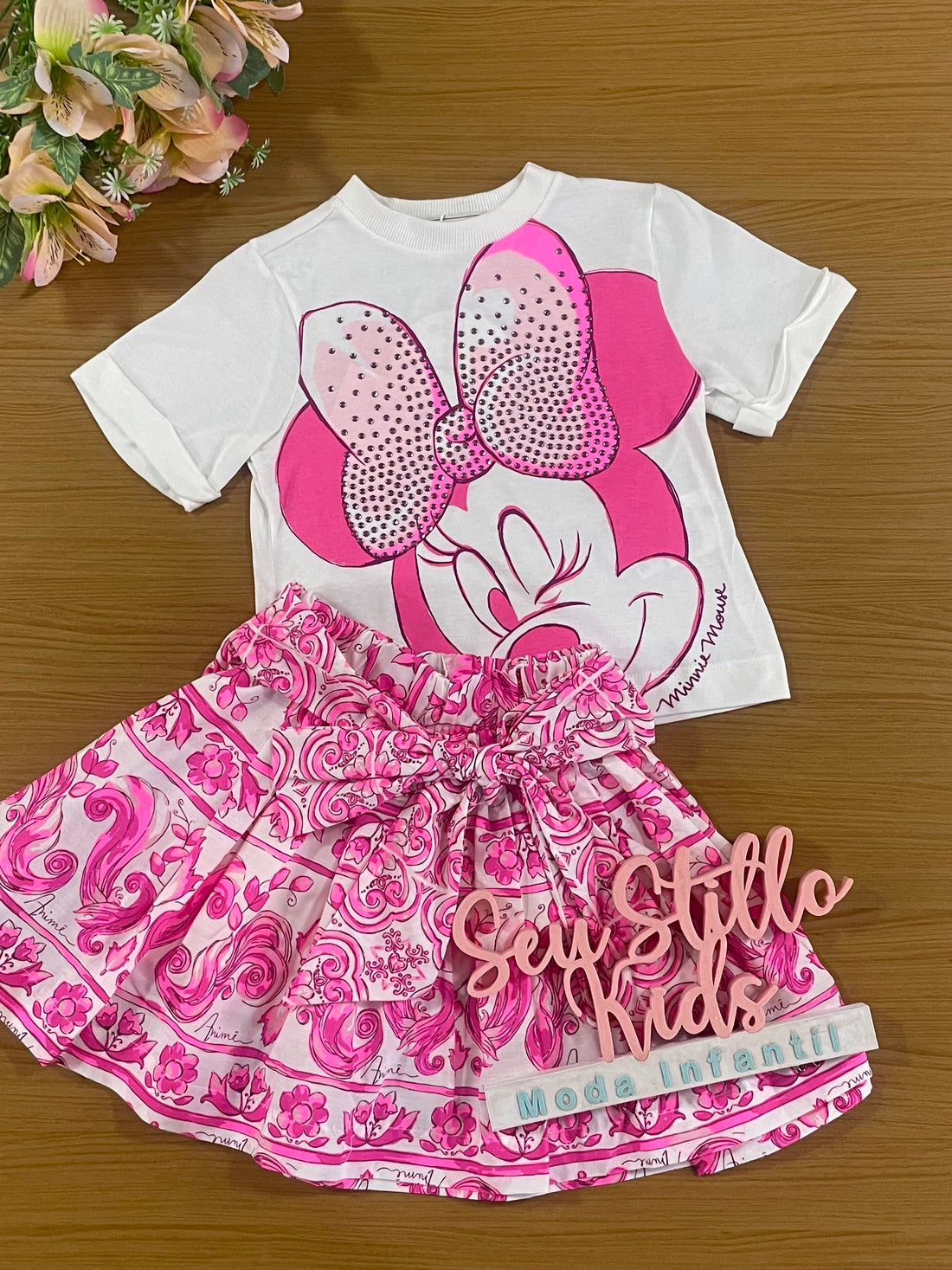 Conjunto Infantil Animê Verão Saia Rosa Minnie e Blusa Off Disney