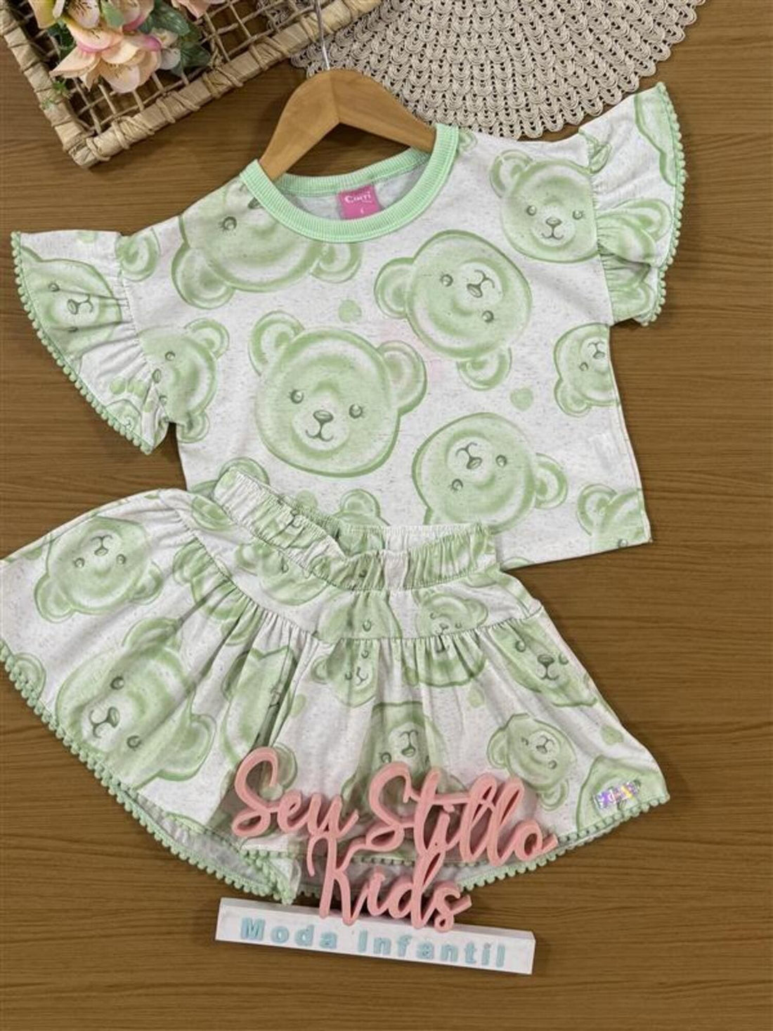 Conjunto Infantil Cinti Verão com Shorts Saia Verde e Blusa Branca Ursinha Docinho