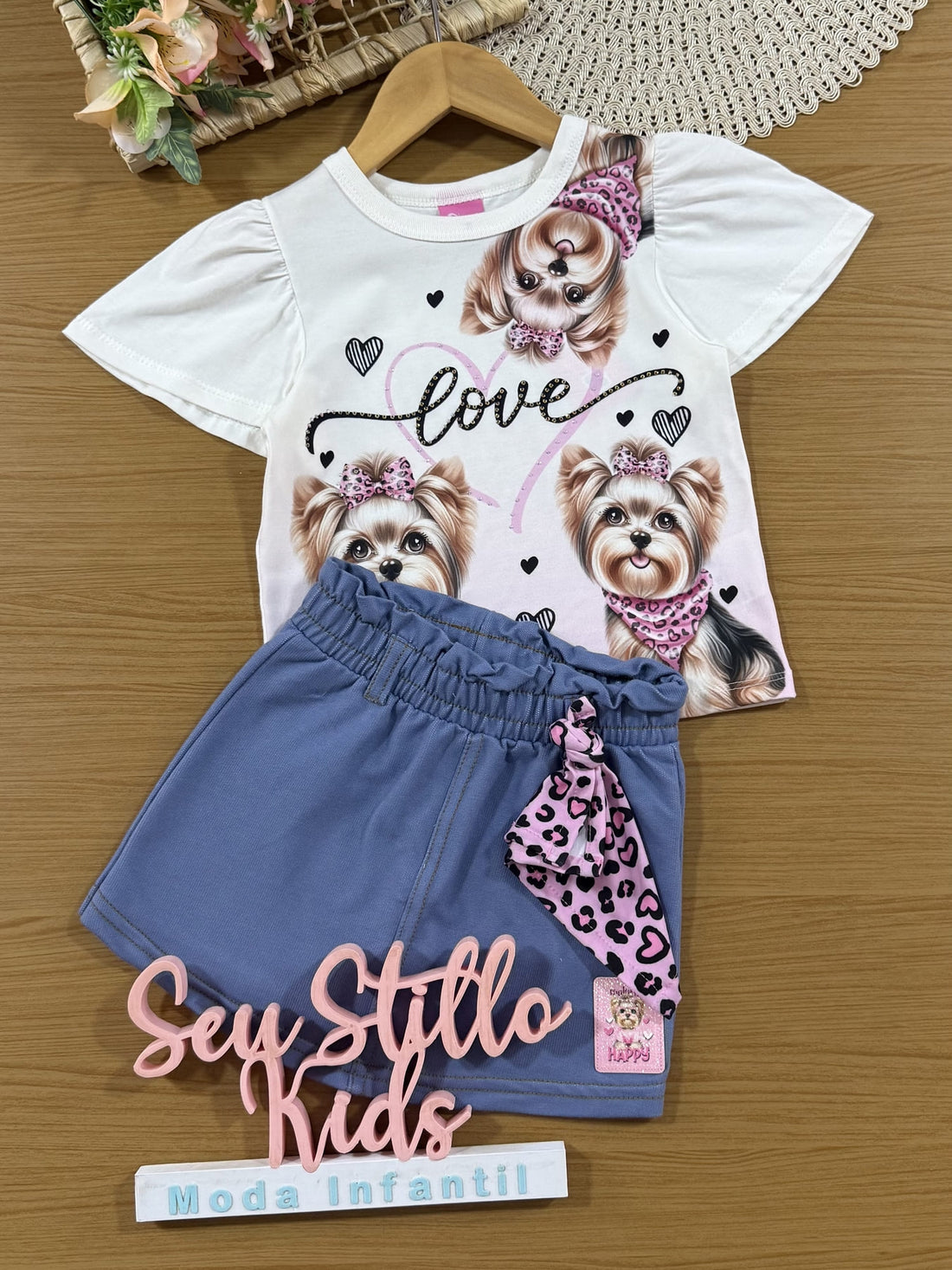 Conjunto Infantil Cinti Verão com Shorts Saia Azul Escuro e Blusa Rosa Cachorrinha Love