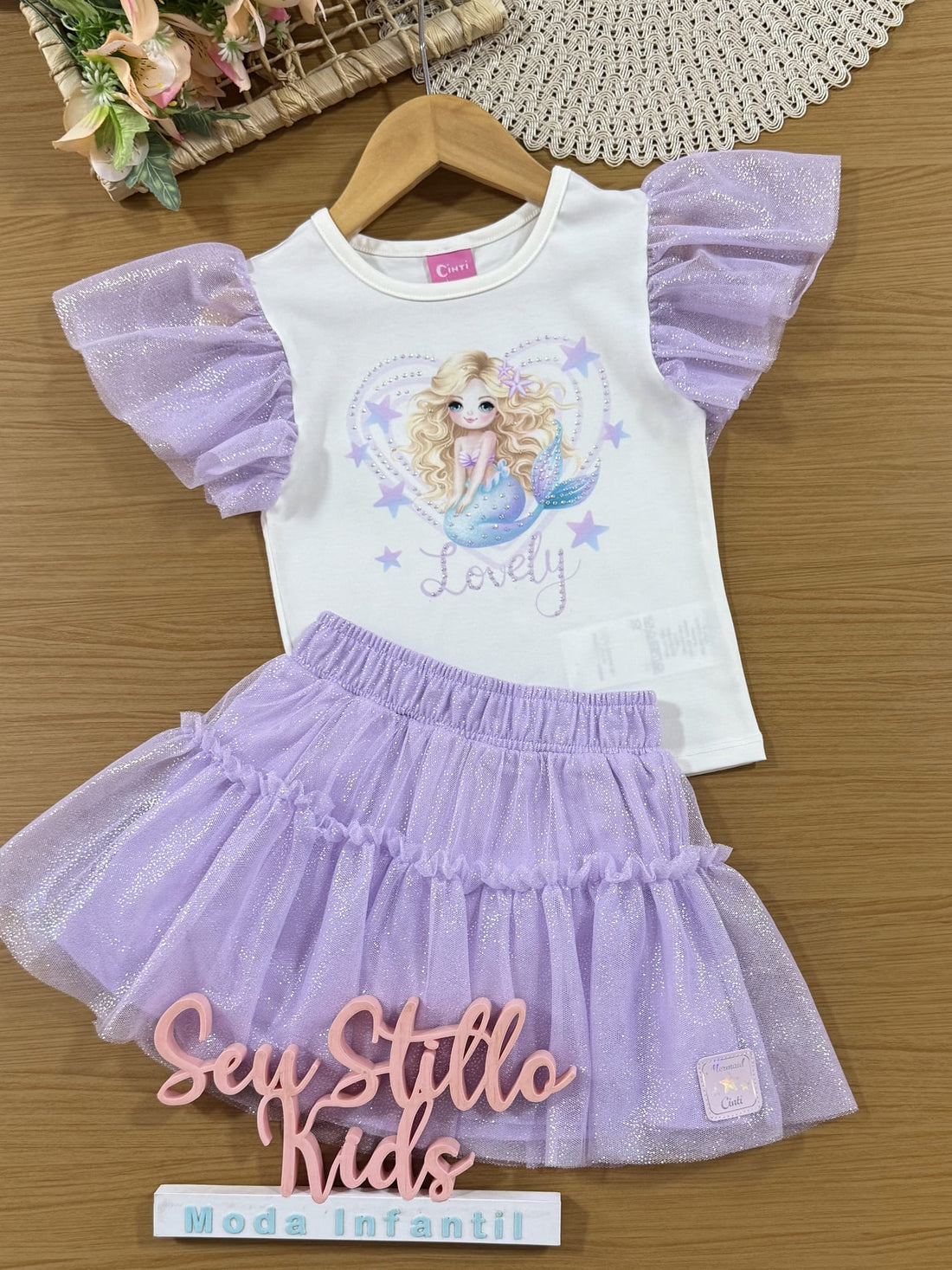 Conjunto Infantil Cinti Verão com Saia Lilás em Tule e Blusa Branca Sereia