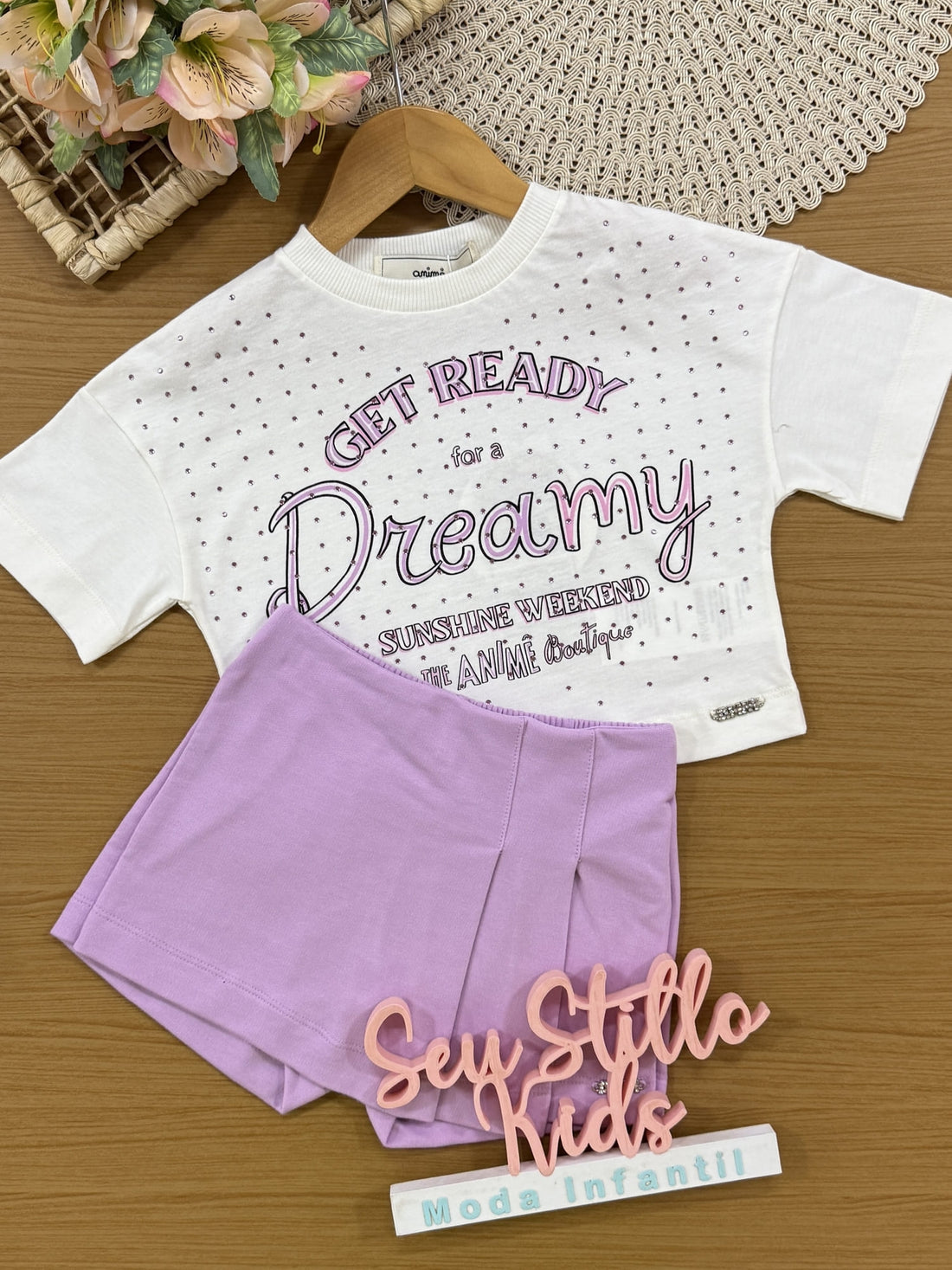 Conjunto Infantil Animê Verão com Shorts Saia Lilás e Blusa Branca Dreamy