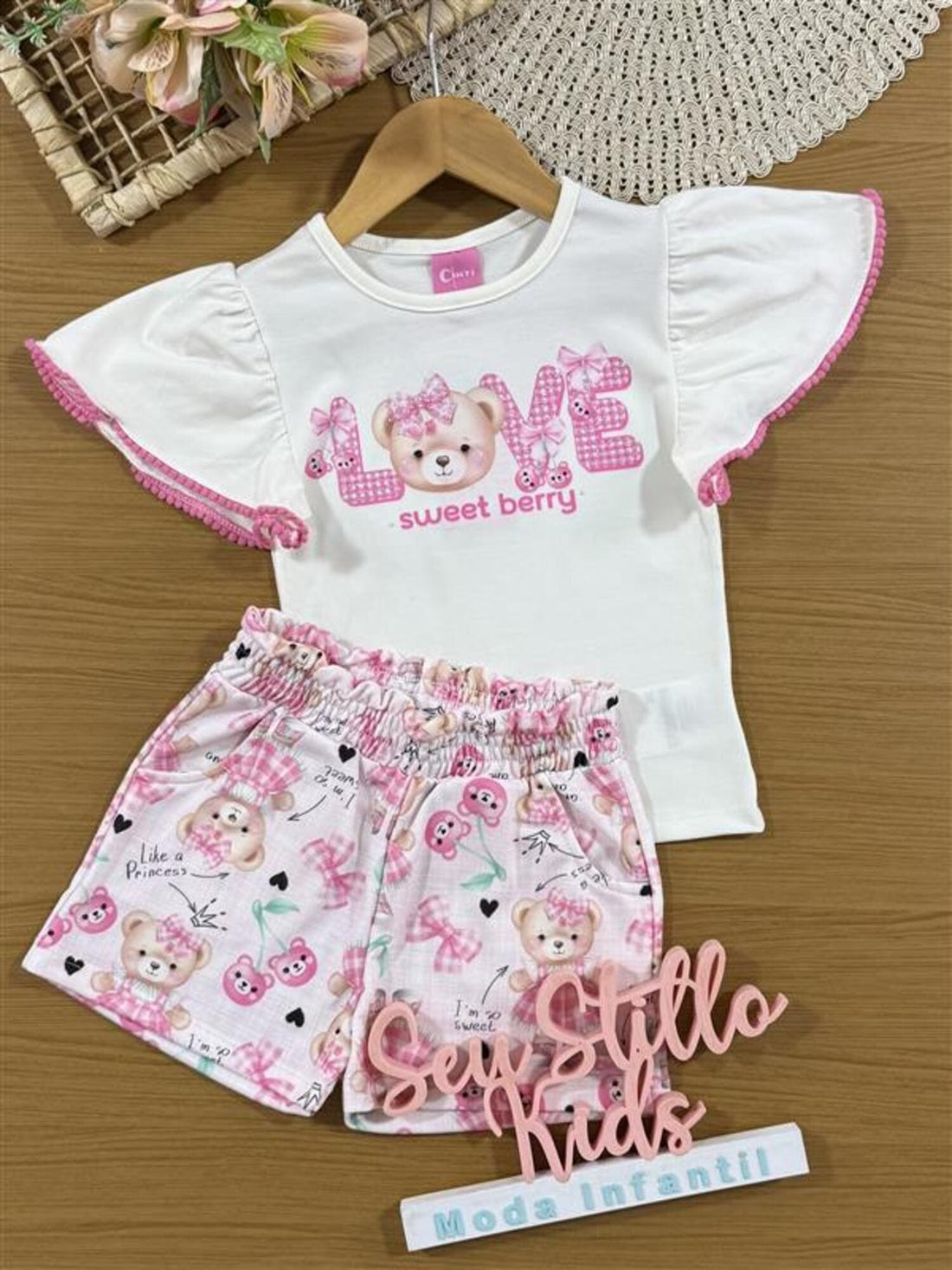 Conjunto Infantil Cinti Verão com Shorts Rosa e Blusa Branca Ursinha Cereja