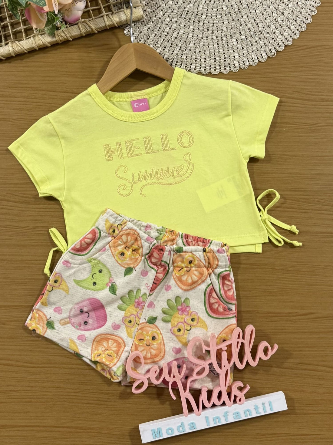 Conjunto Infantil Cinti Verão com Shorts Off White e Blusa Amarela Hello