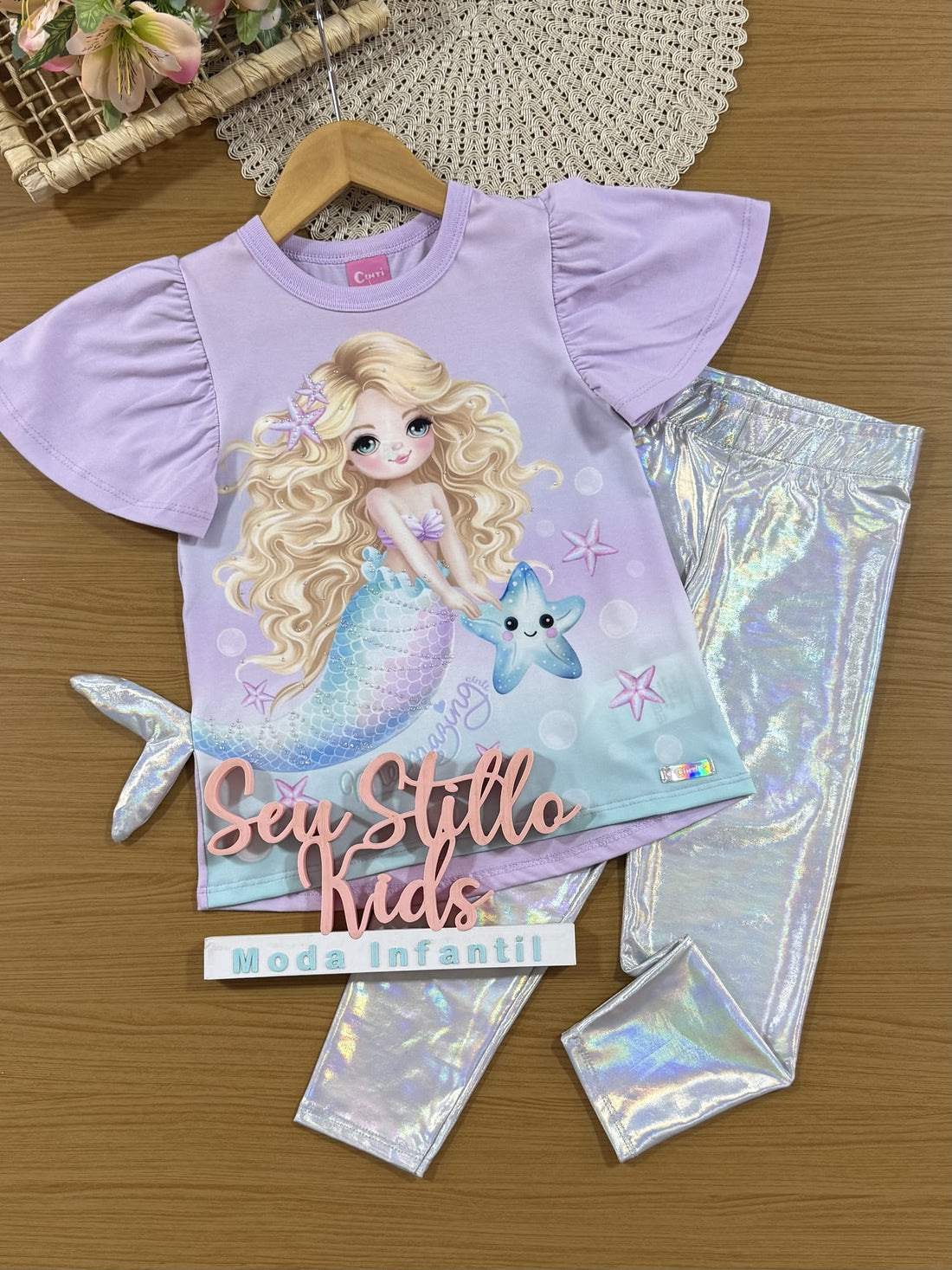 Conjunto Infantil Cinti Verão com Calça Holográfica e Blusa Lilás Sereia