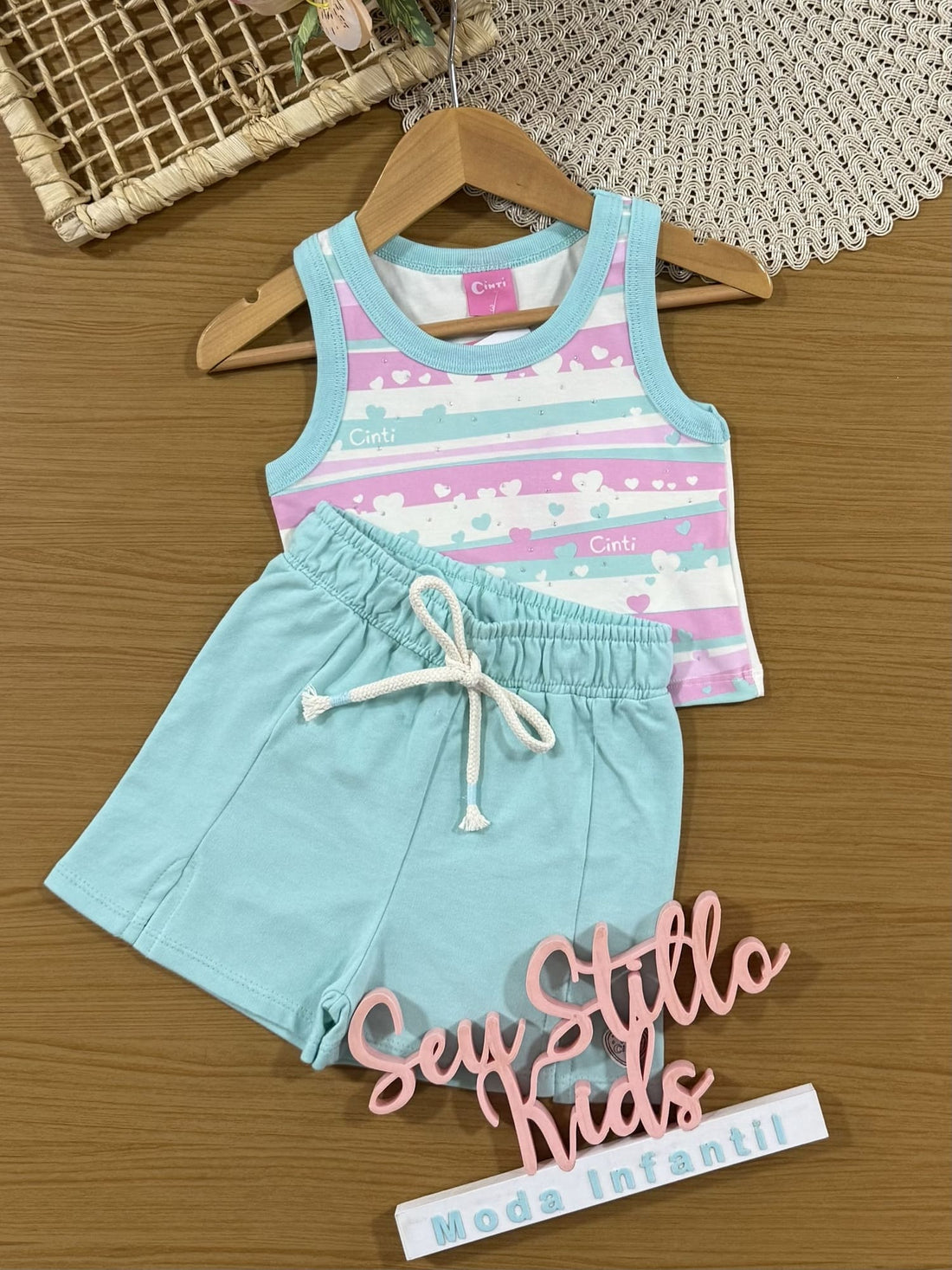 Conjunto Infantil Cinti Verão com Shorts Azul e Blusa Listrada Corações