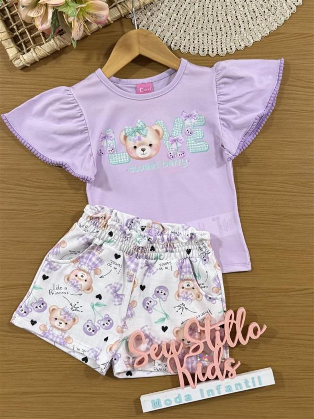 Conjunto Infantil Cinti Verão com Shorts e Blusa Lilás Ursinha Love com Strass