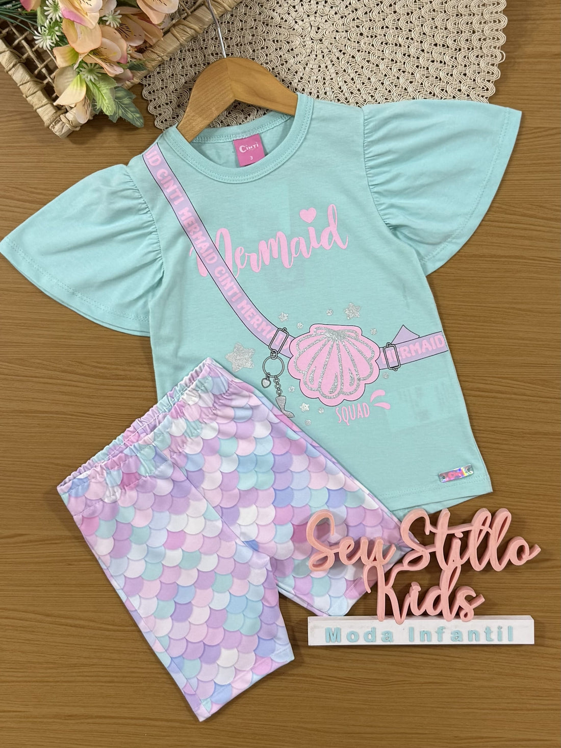 Conjunto Infantil Cinti Verão com Shorts Ciclista e Blusa Azul Conchinha