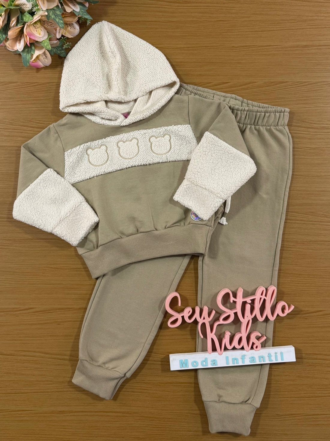 Conjunto Infantil Cinti Inverno Calça e Moletom Flanelado Bege Ursinha com Bolso