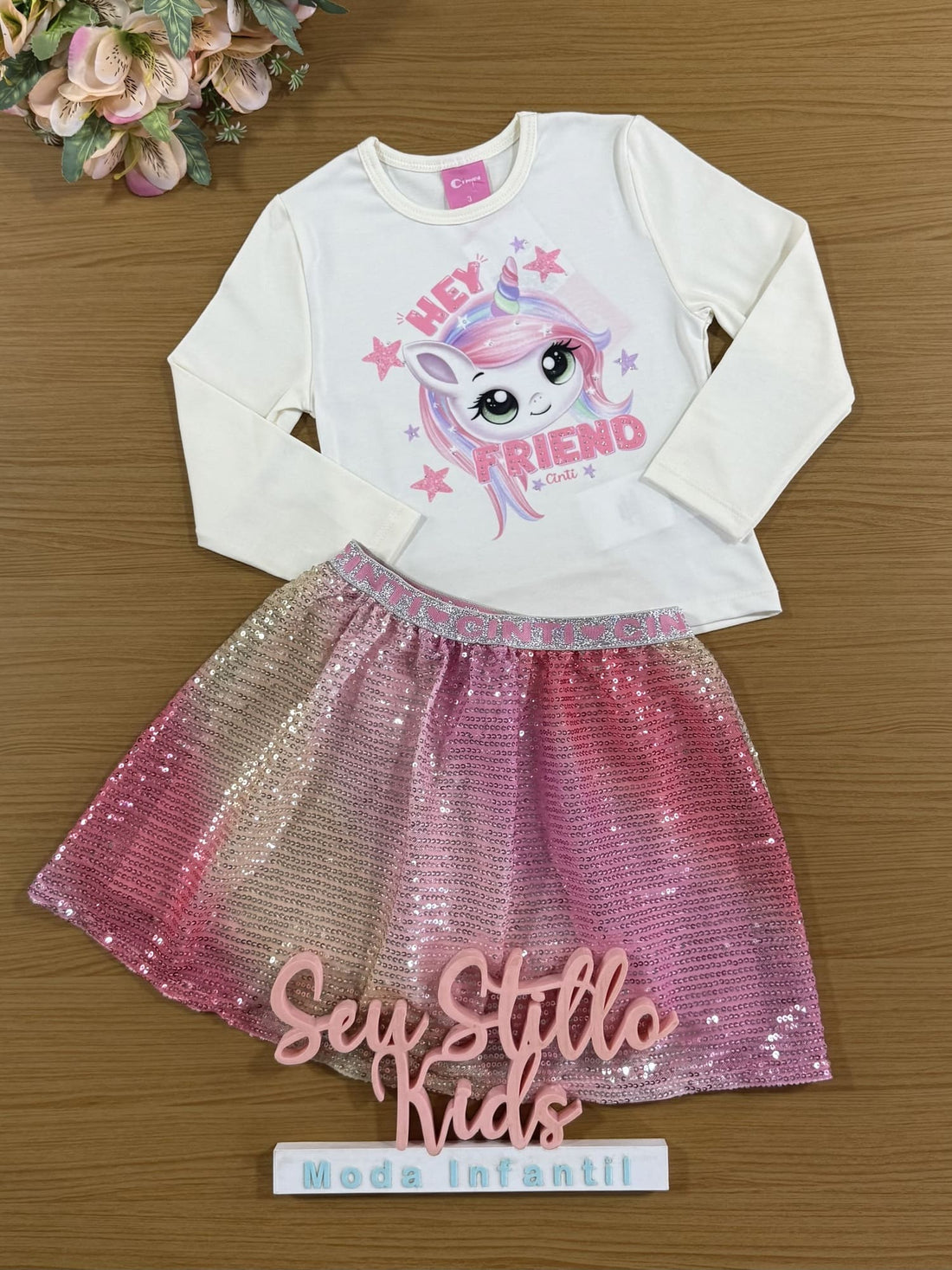 Conjunto Infantil Cinti Inverno com Short Saia Paetê e Blusa Branca Unicórnio