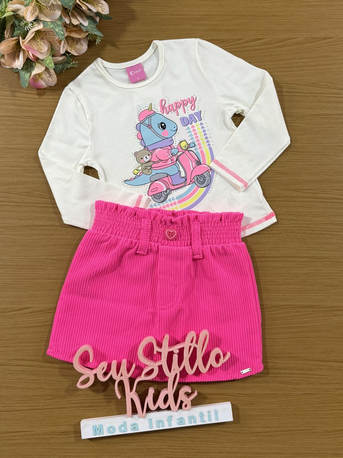 Conjunto Infantil Kukiê Inverno com Shorts Saia Rosa e Blusa Branca Sorvetinho