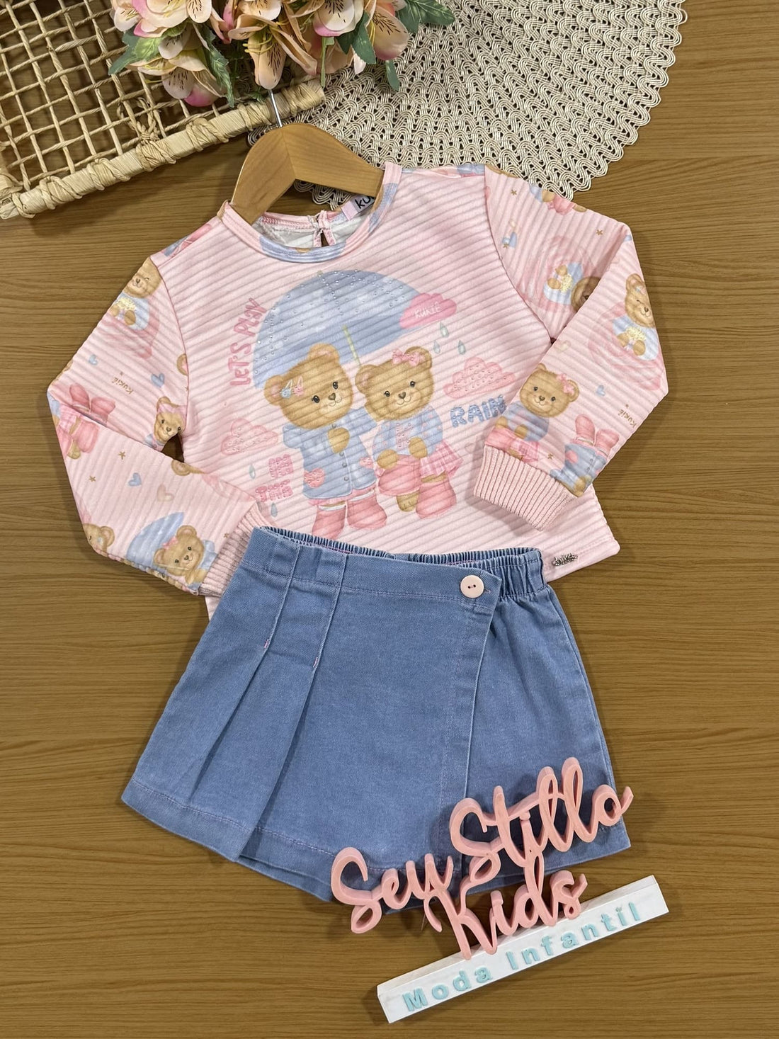Conjunto Infantil Kukiê Inverno com Shorts Saia Jeans e Blusa Manga Longa Rosa Ursinhas