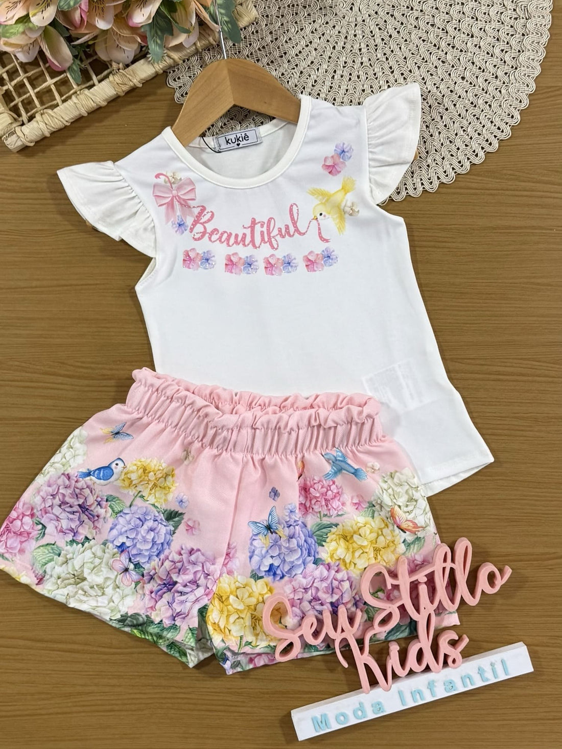 Conjunto Infantil Kukiê com Shorts Rosa e Blusa Manga Curta Floral