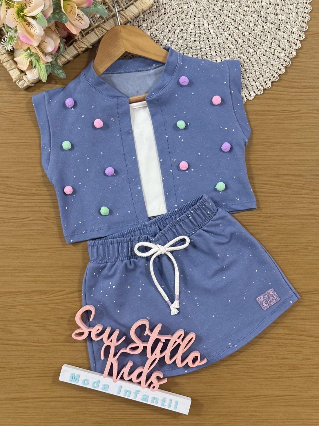 Conjunto Infantil Cinti Verão com Shorts Saia e Cropped com Colete Azul