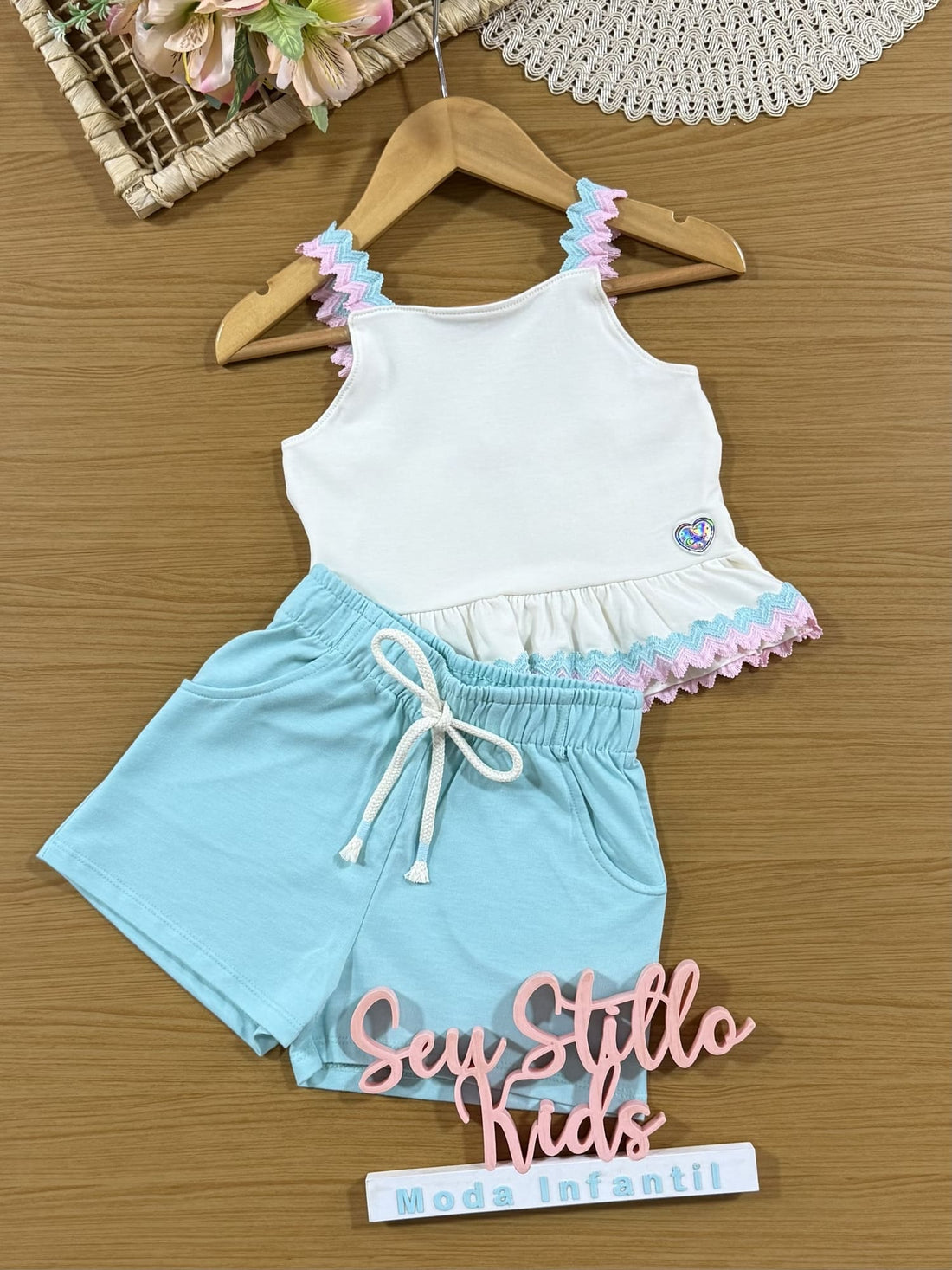 Conjunto Infantil Cinti Verão com Shorts Azul e Cropped Branco