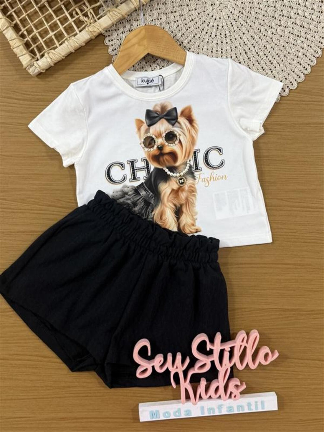 Conjunto Infantil Kukiê Verão com Shorts Preto e Blusa Branca Cachorrinha