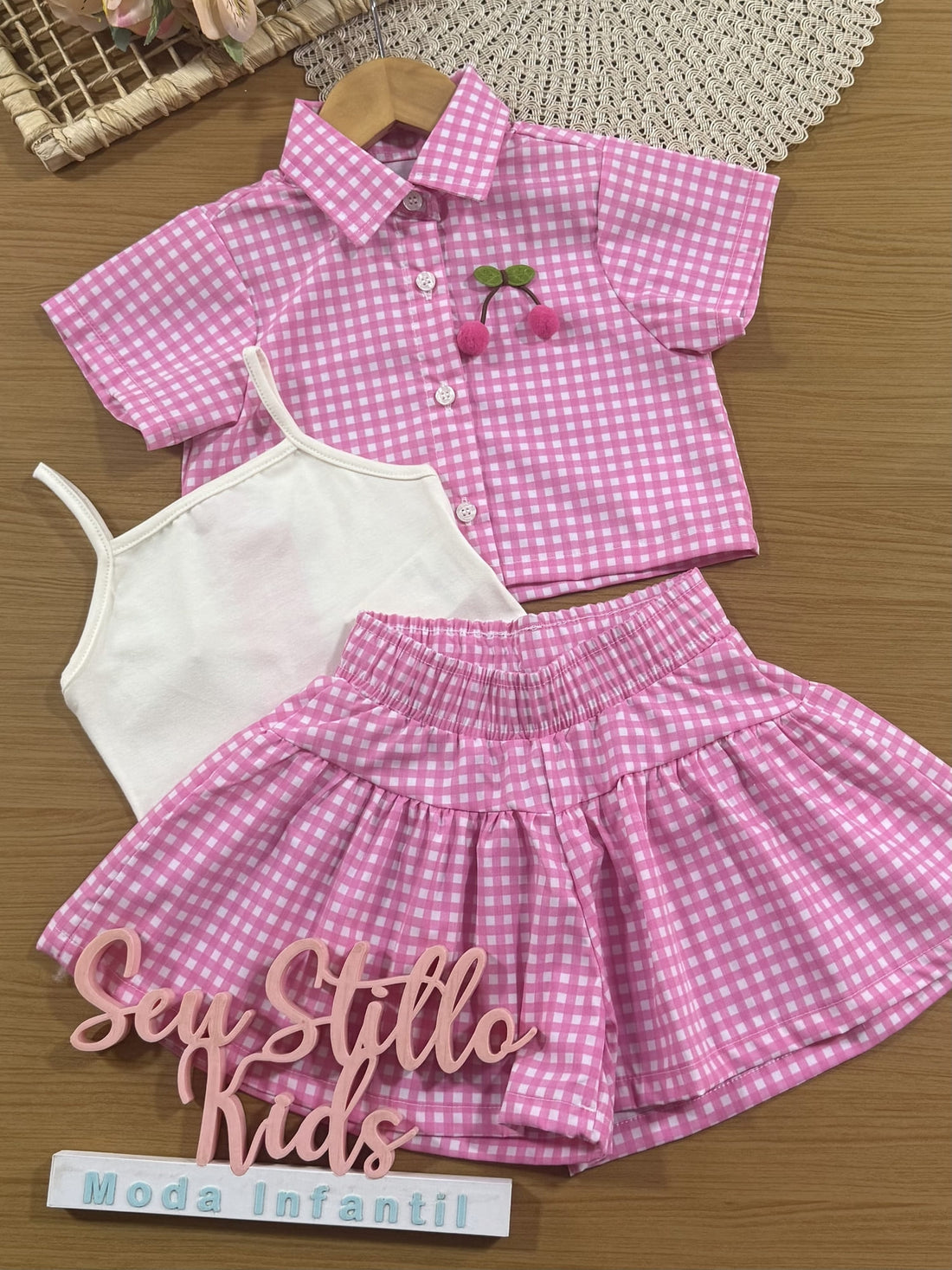 Conjunto Infantil Cinti Verão com Shorts, Blusa e Sobreposição Rosa Xadrez