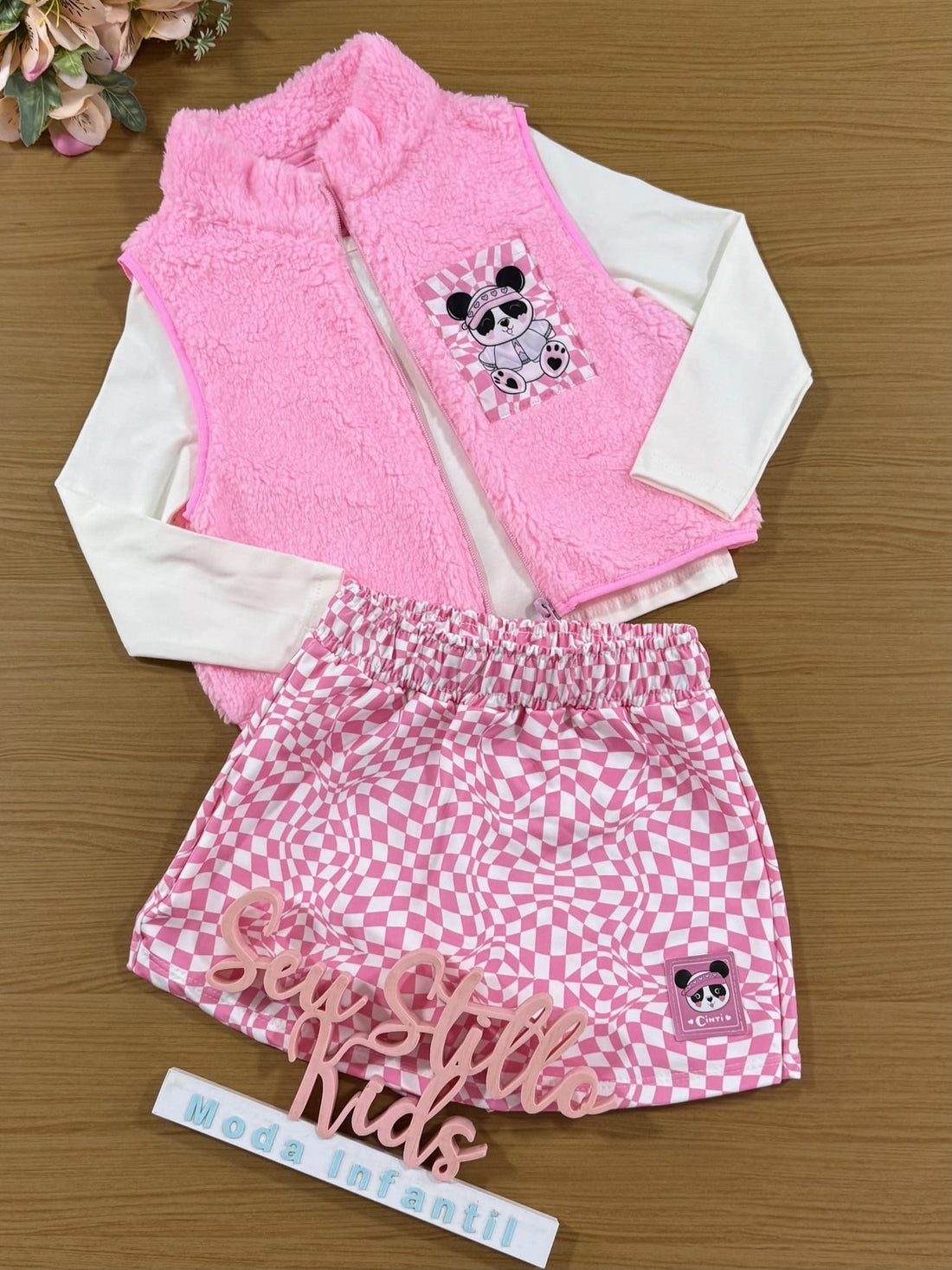 Conjunto Infantil Cinti Inverno Shorts Saia, Blusa e Colete Rosa Panda