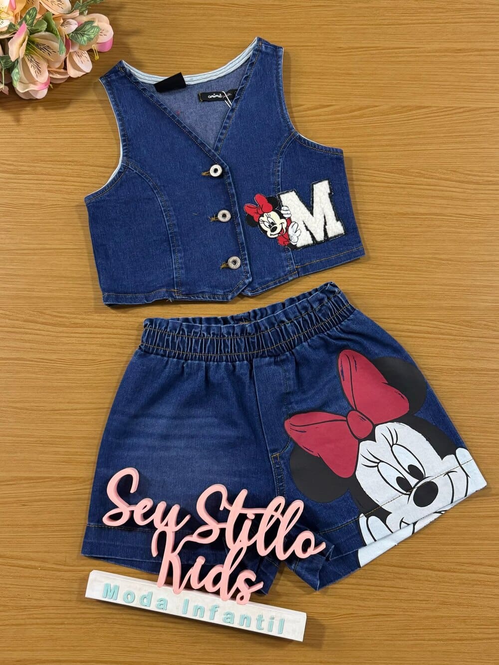 Conjunto Infantil Animê Verão Shorts e Colete Jeans Minnie Disney