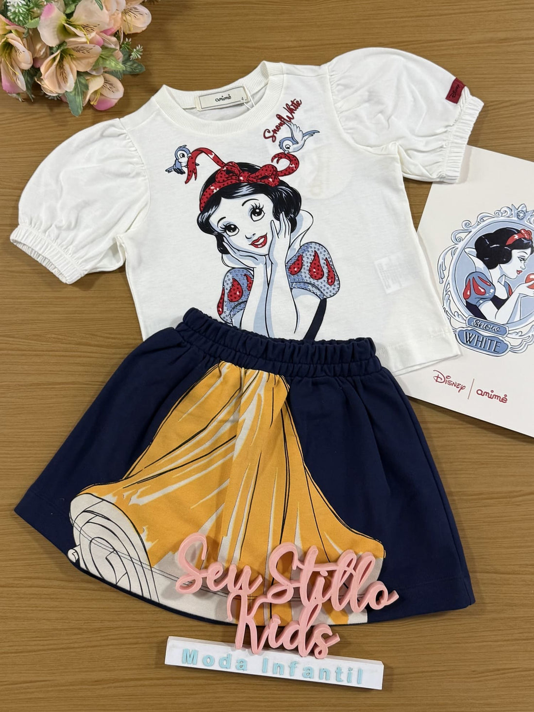 Conjunto Infantil Animê Saia e Blusa Manga Curta Branca de Neve Disney
