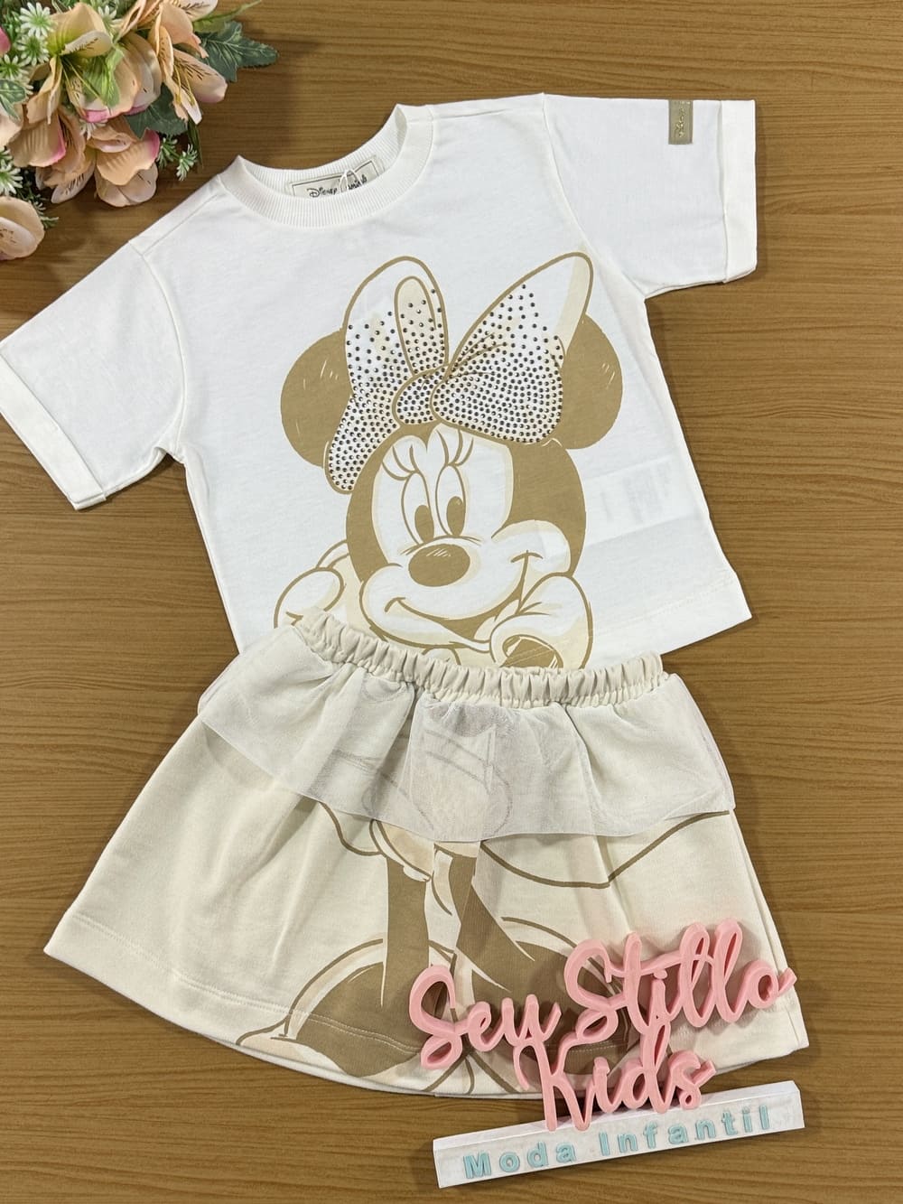 Conjunto Infantil Animê Verão Shorts Saia Bege e Blusa Minnie Laço Disney