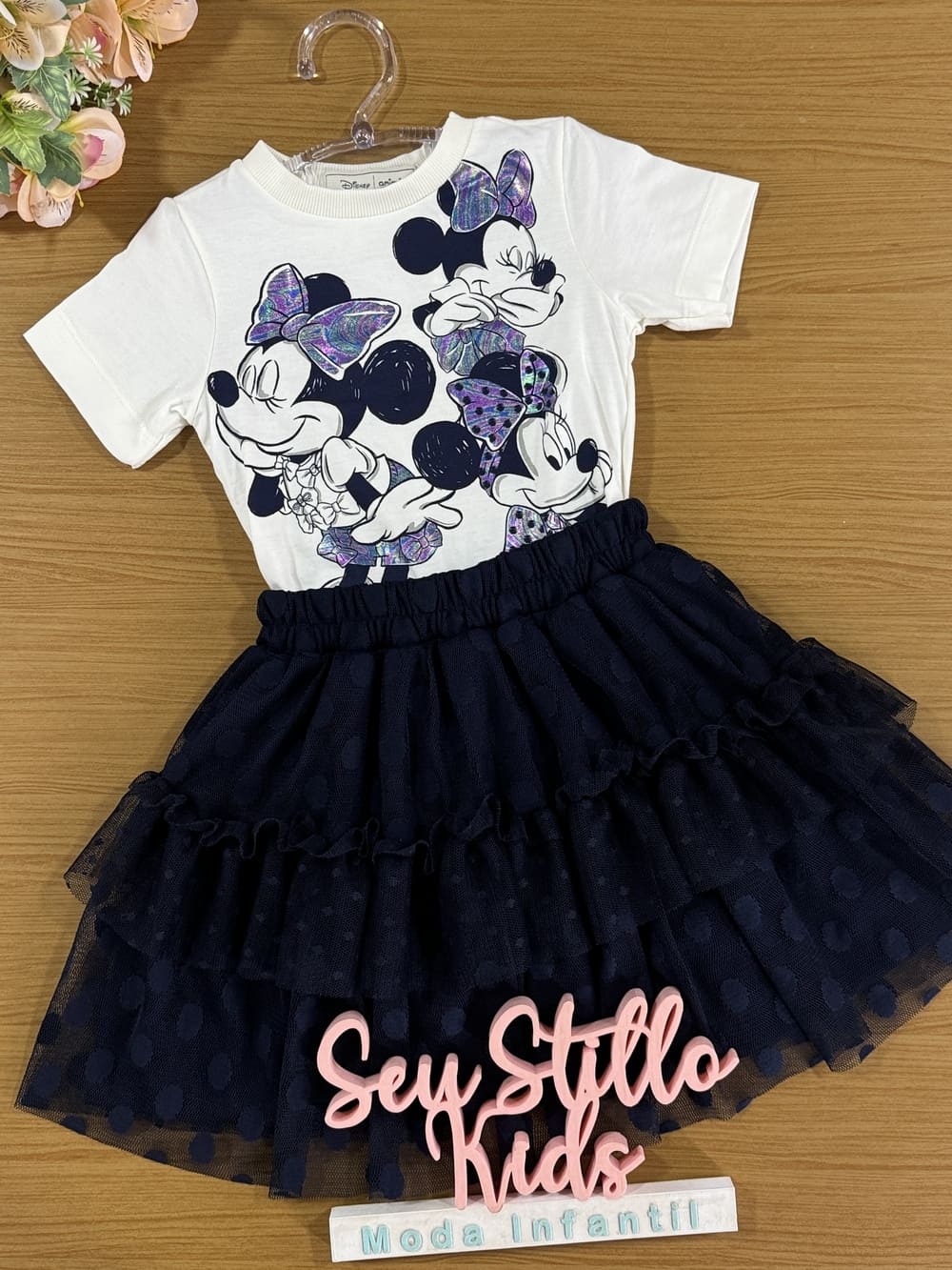 Conjunto Infantil Animê Verão Saia Marinho Tule e Blusa Minnie Disney