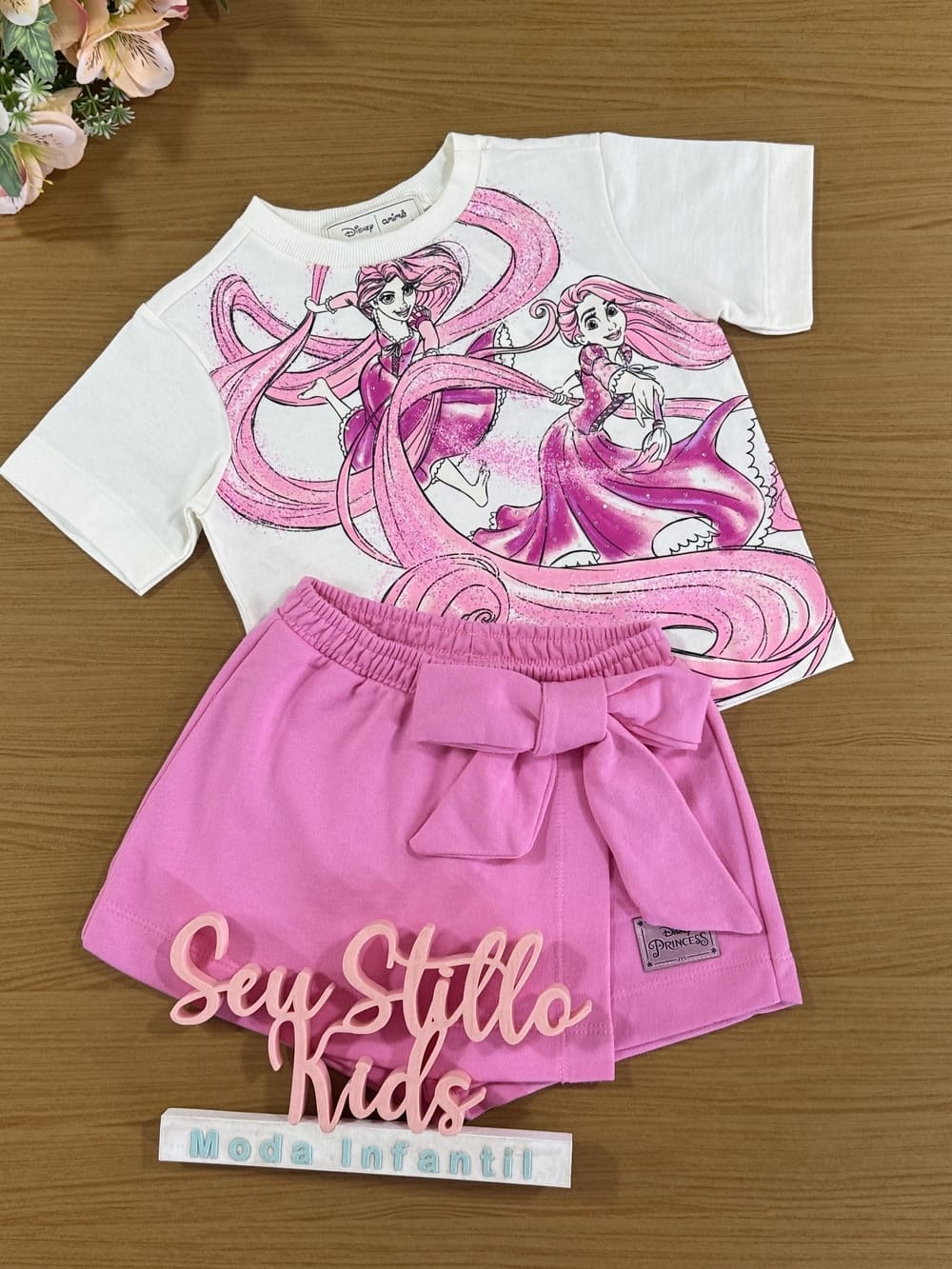 Conjunto Infantil Animê Verão Shorts Saia Rosa e Blusa Rapunzel Disney