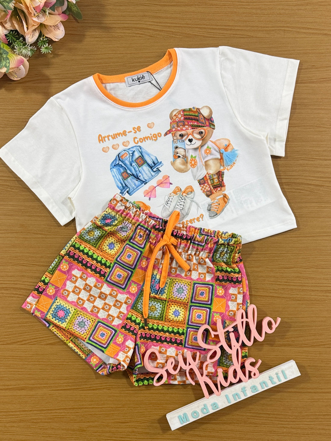 Conjunto Infantil Kukie Verão Shorts Blusa Ursinho Patchwork
