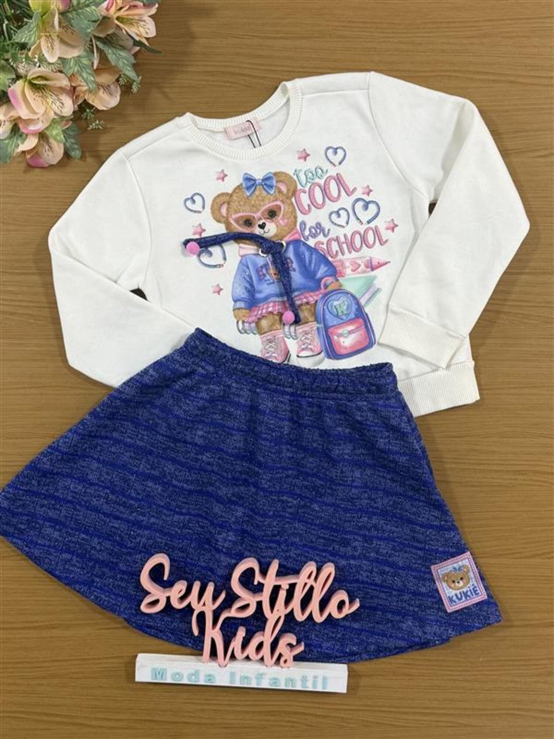 Conjunto Infantil Kukiê Inverno com Saia Azul e Casaco Branco Ursinha com Strass