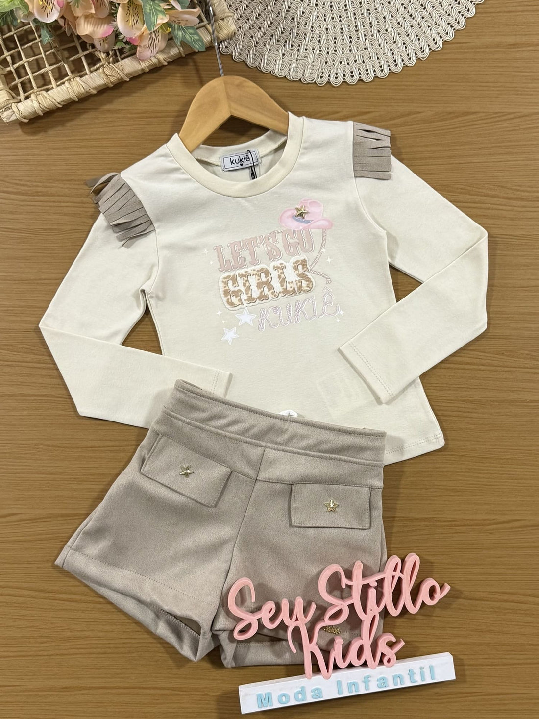 Conjunto Infantil Kukiê Inverno com Shorts e Blusa Manga Longa Bege Cowgirl