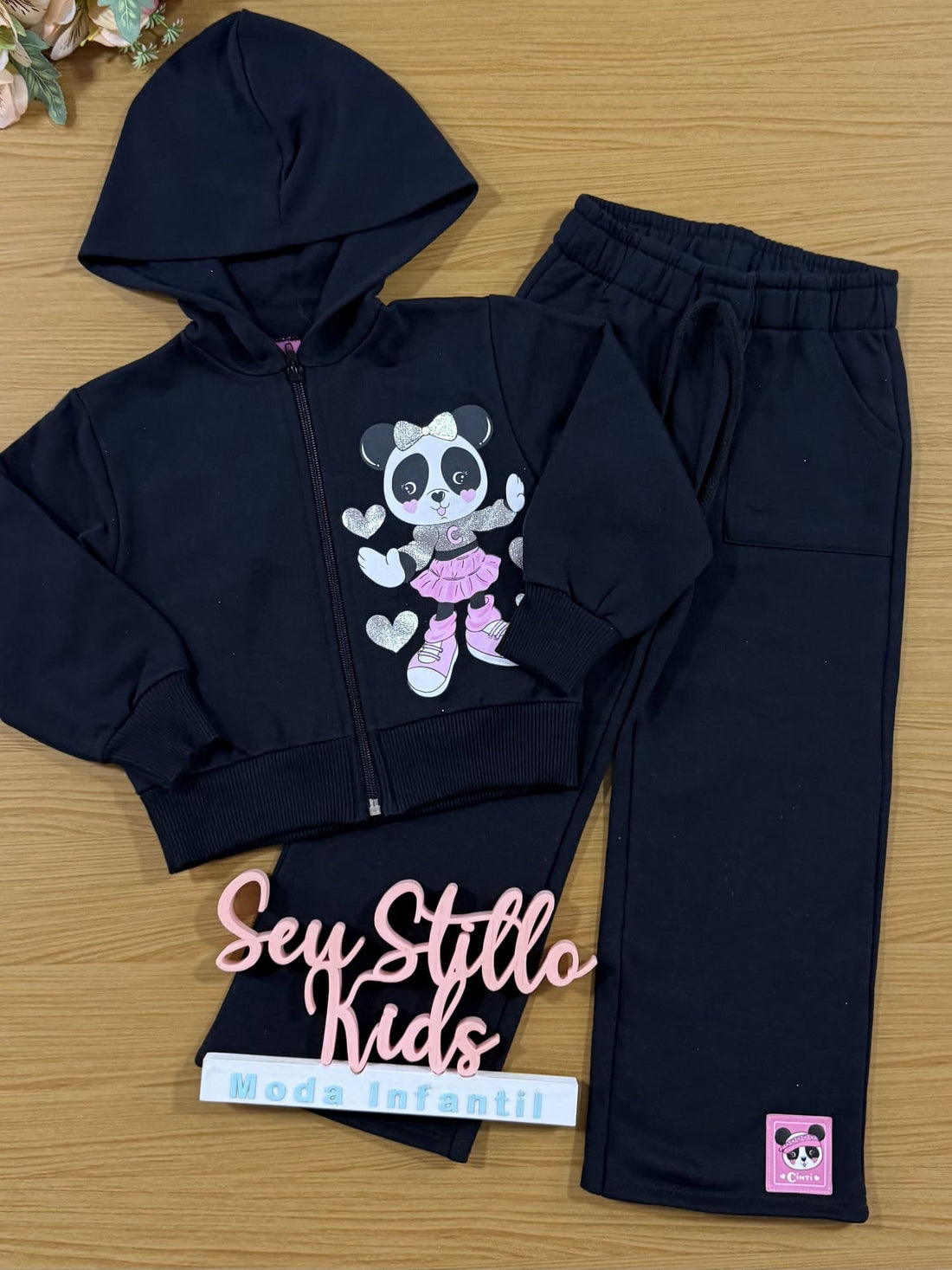Conjunto Infantil Cinti Inverno Calça Wide Leg e Moletom Flanelado Preto Panda