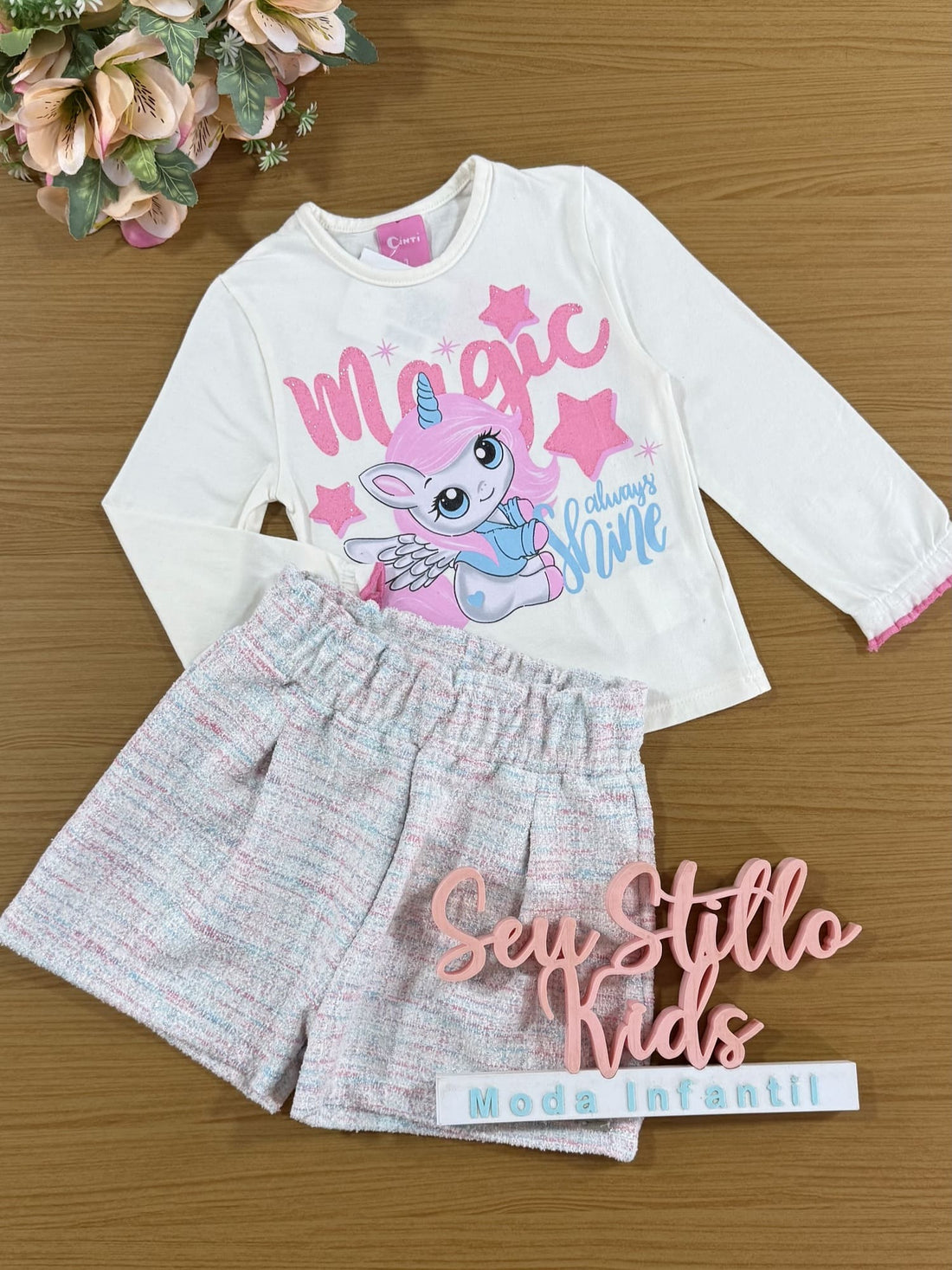 Conjunto Infantil Cinti Inverno Shorts Tweed E Blusa Unicórnio Rosa