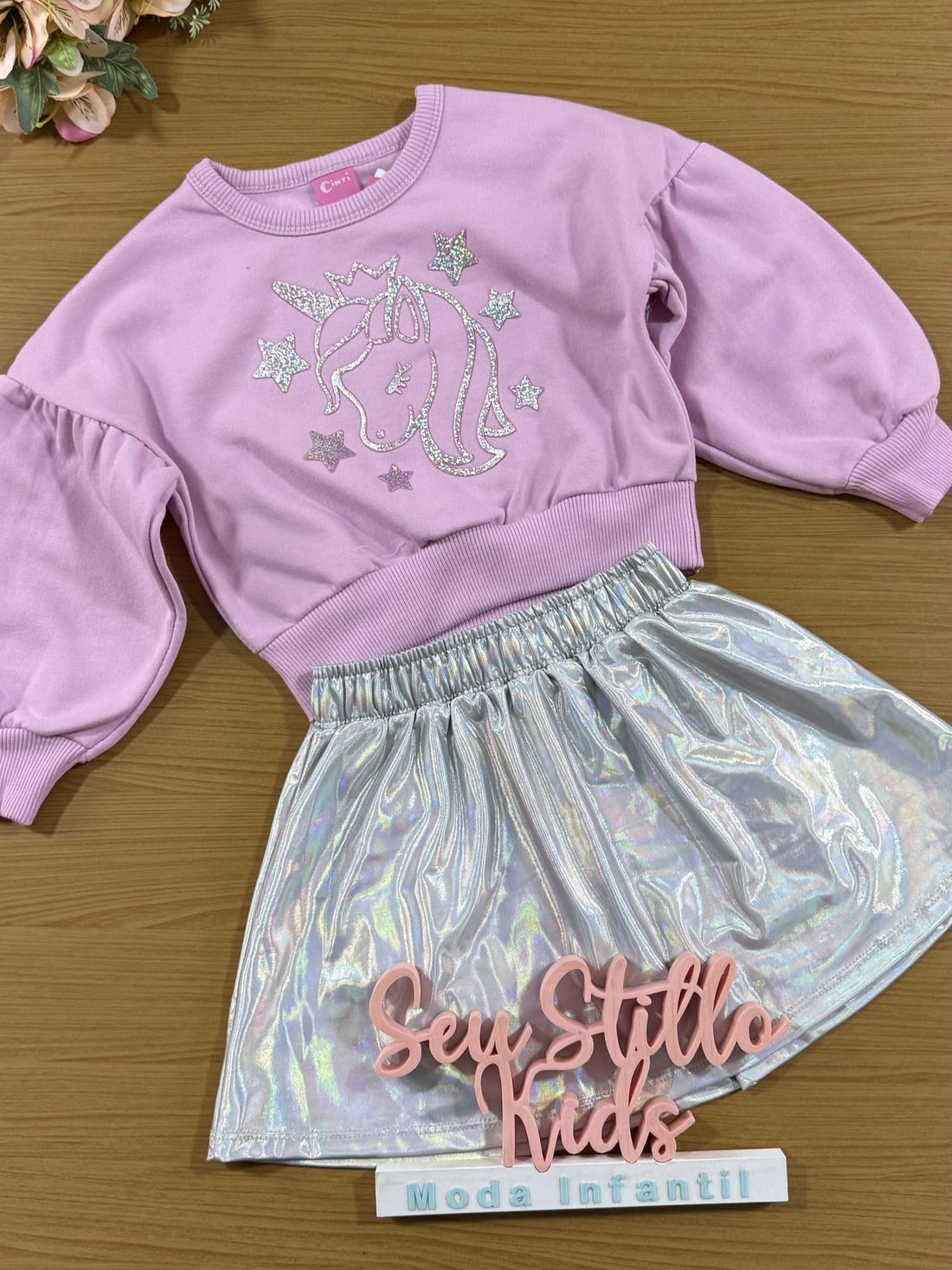 Conjunto Infantil Cinti Inverno Saia e Moletom Flanelado Lilás Unicórnio