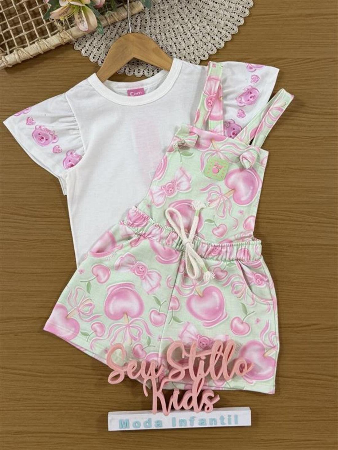 Jardineira Infantil Cinti Verão Verde Docinhos com Blusa Branca