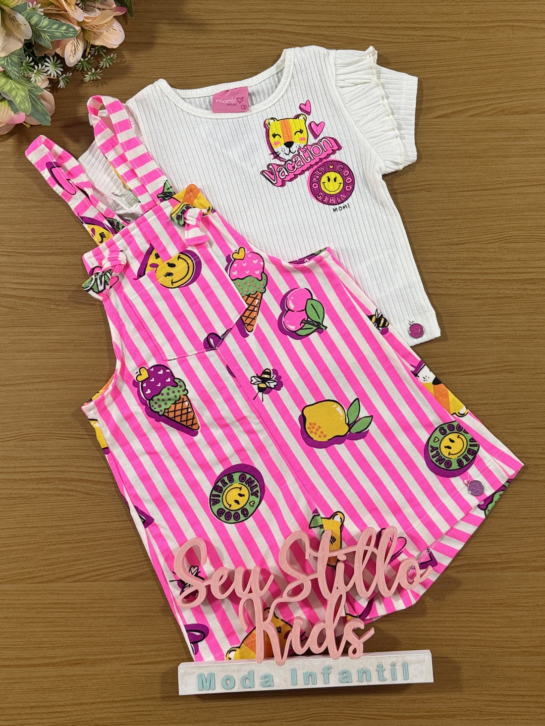 Jardineira Infantil Momi Verão Rosa Listrada Icones com Blusa