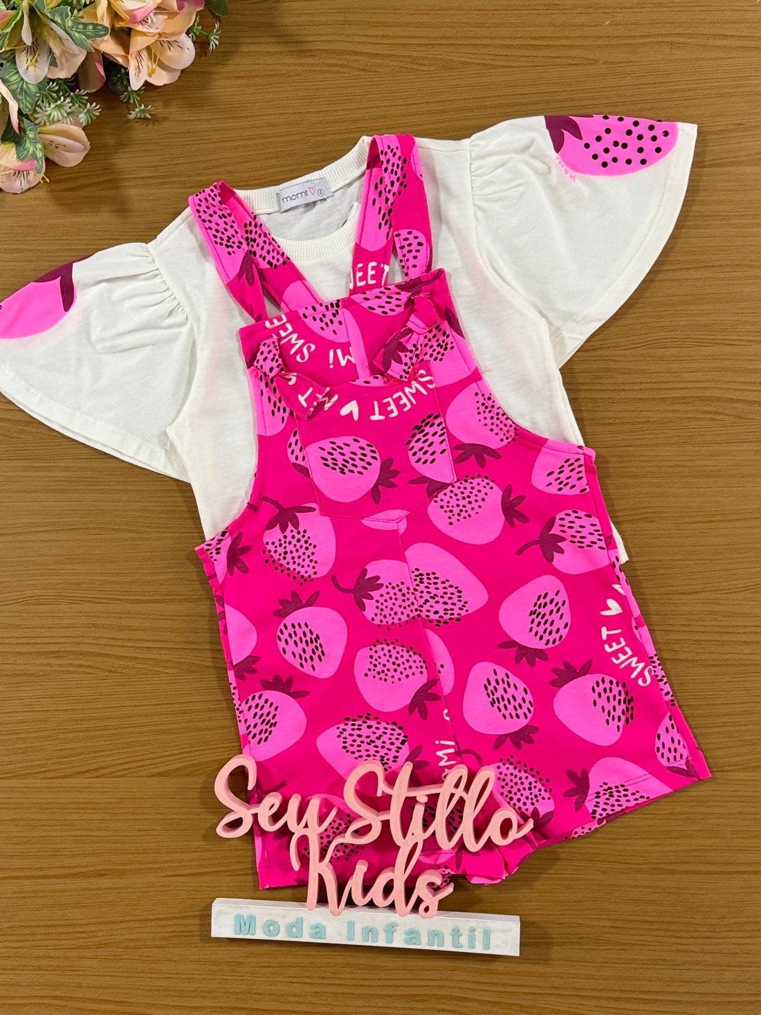 Jardineira Infantil Momi Verão Rosa Morango com Blusa