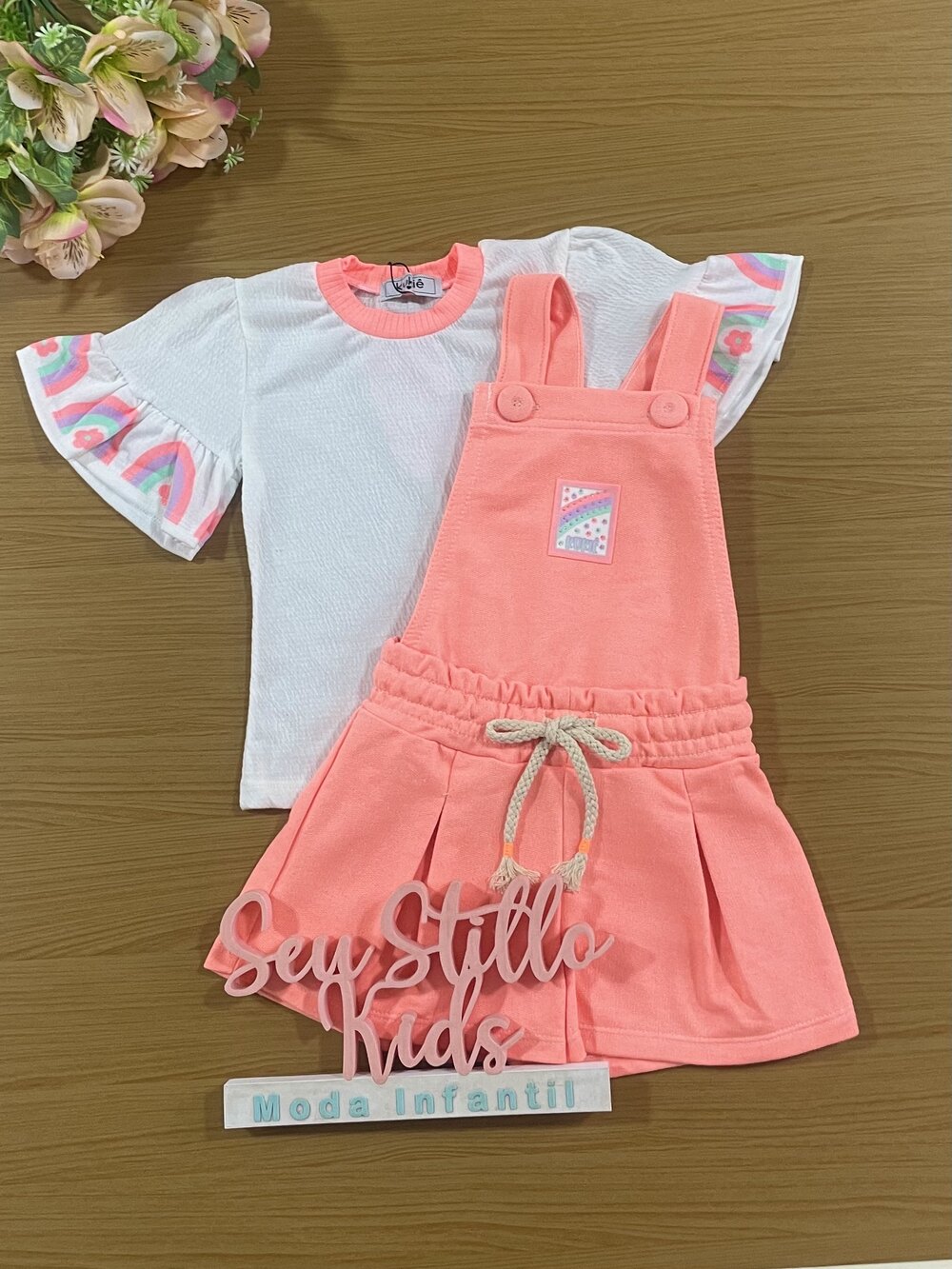 Jardineira Infantil Kukiê Verão Rosa Arco-íris e Blusa Branca