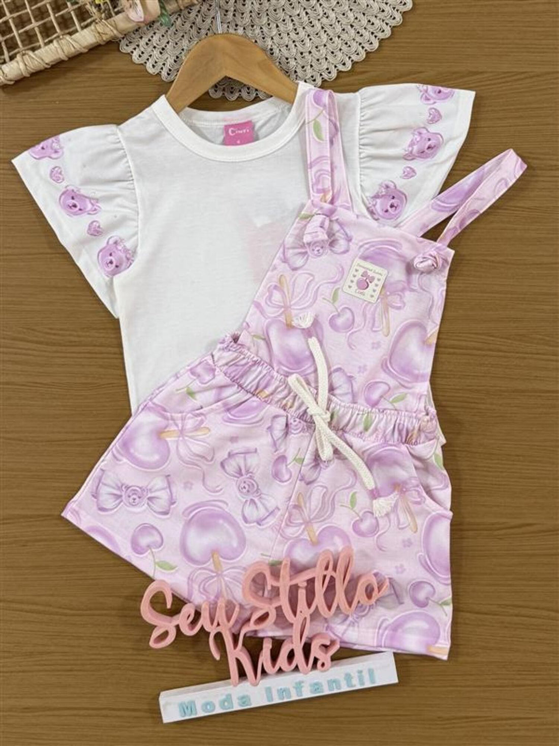Jardineira Infantil Cinti Verão Lilás Docinhos com Blusa Branca