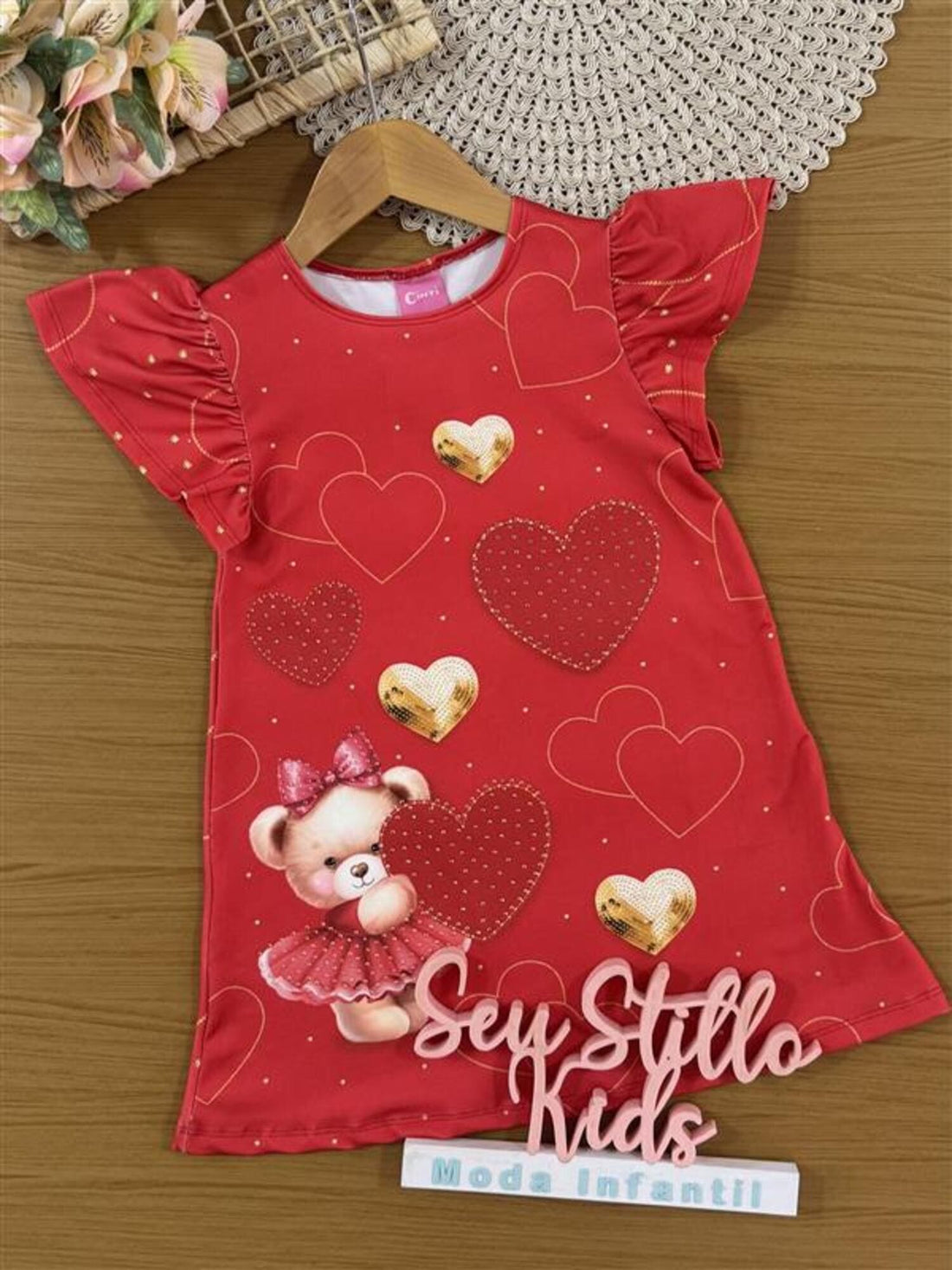 Vestido Infantil Cinti Verão Vermelho Ursinha Corações
