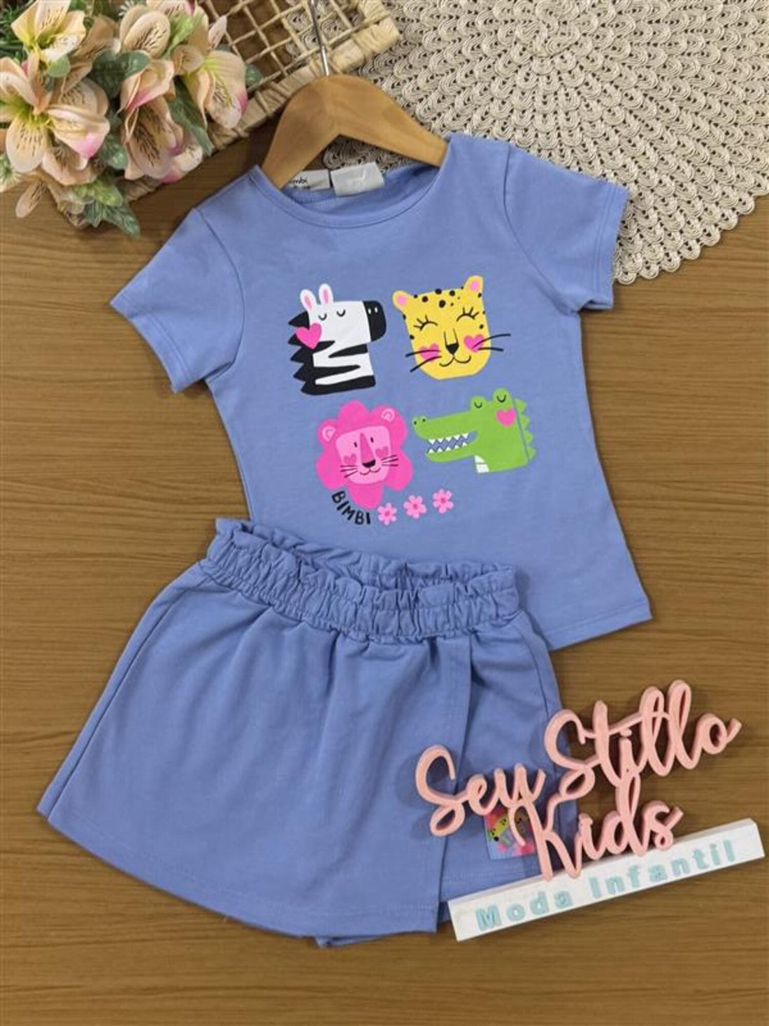 Conjunto Infantil Bimbi Verão com Shorts Saia e Blusa Azul Animais