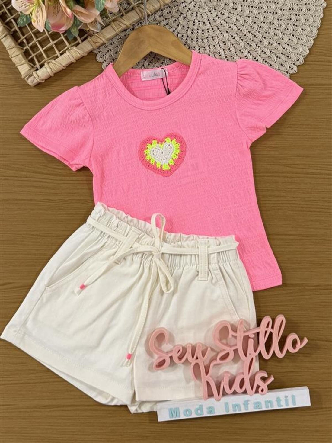 Conjunto Infantil Kukiê Verão com Shorts Off White e Blusa Rosa Coração Tricô