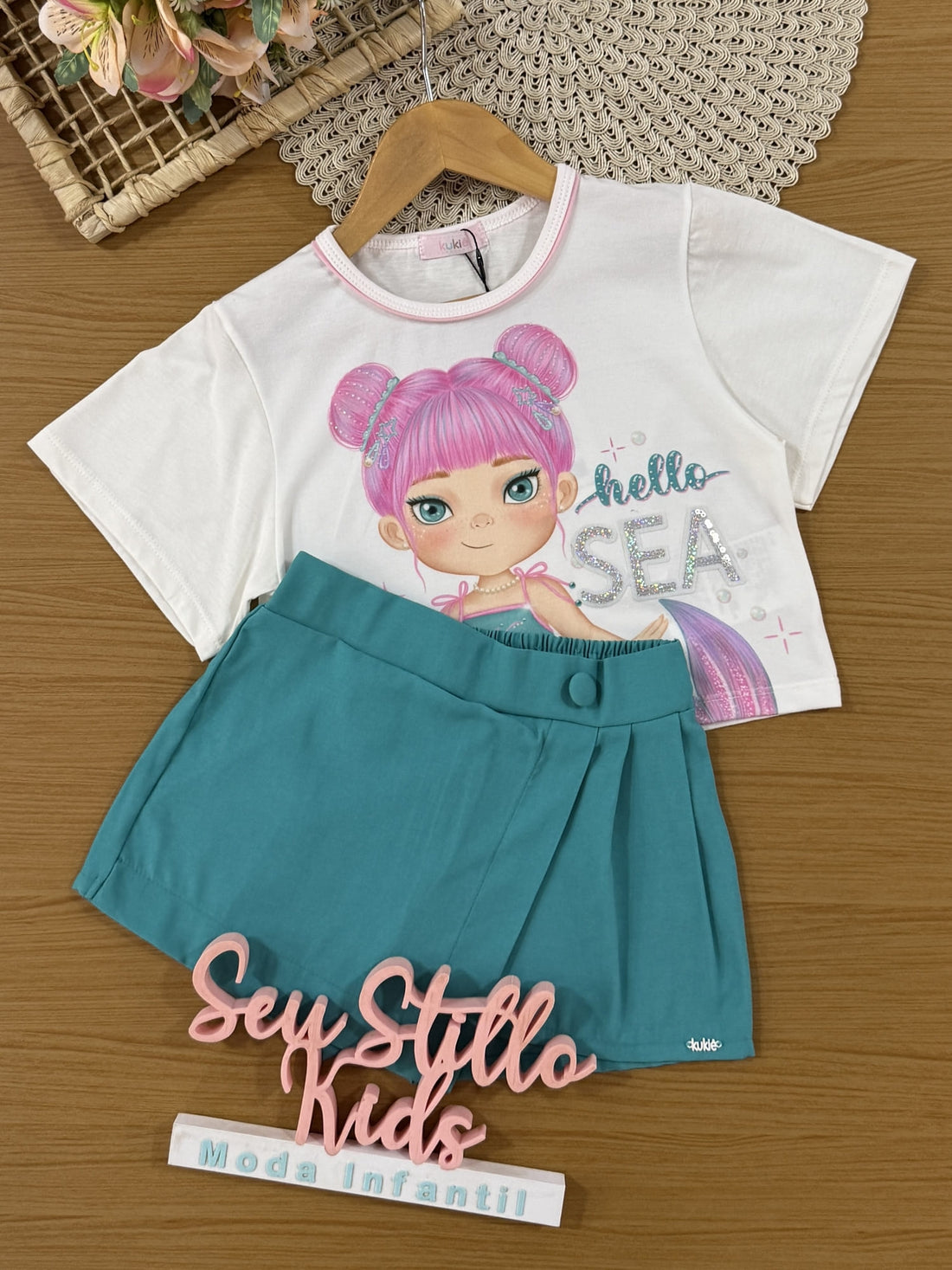 Conjunto Infantil Kukiê Verão com Shorts Saia Azul e Blusa Branca Sereia