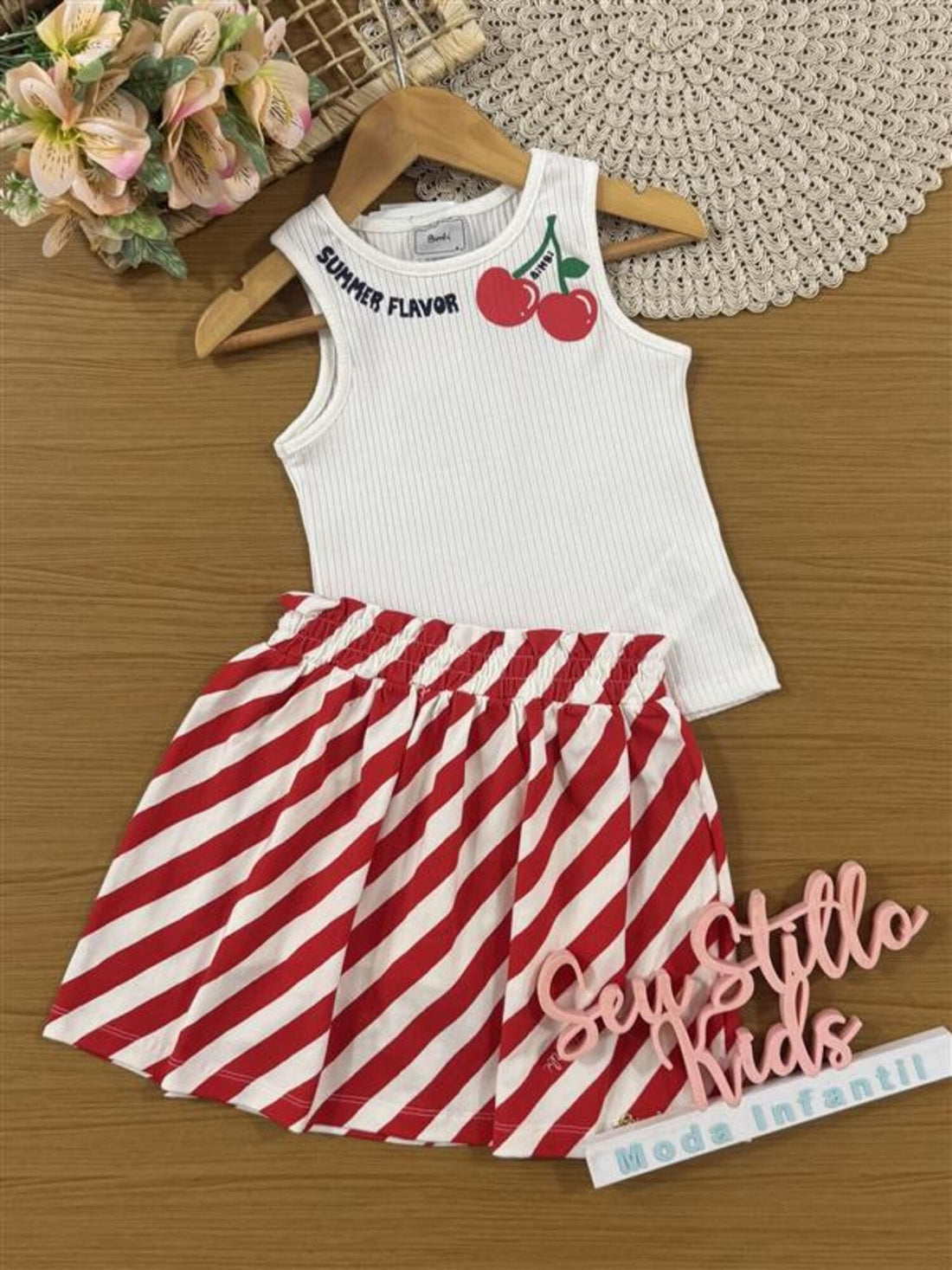 Conjunto Infantil Bimbi Verão com Saia Listrada e Regata Branca Cerejinha