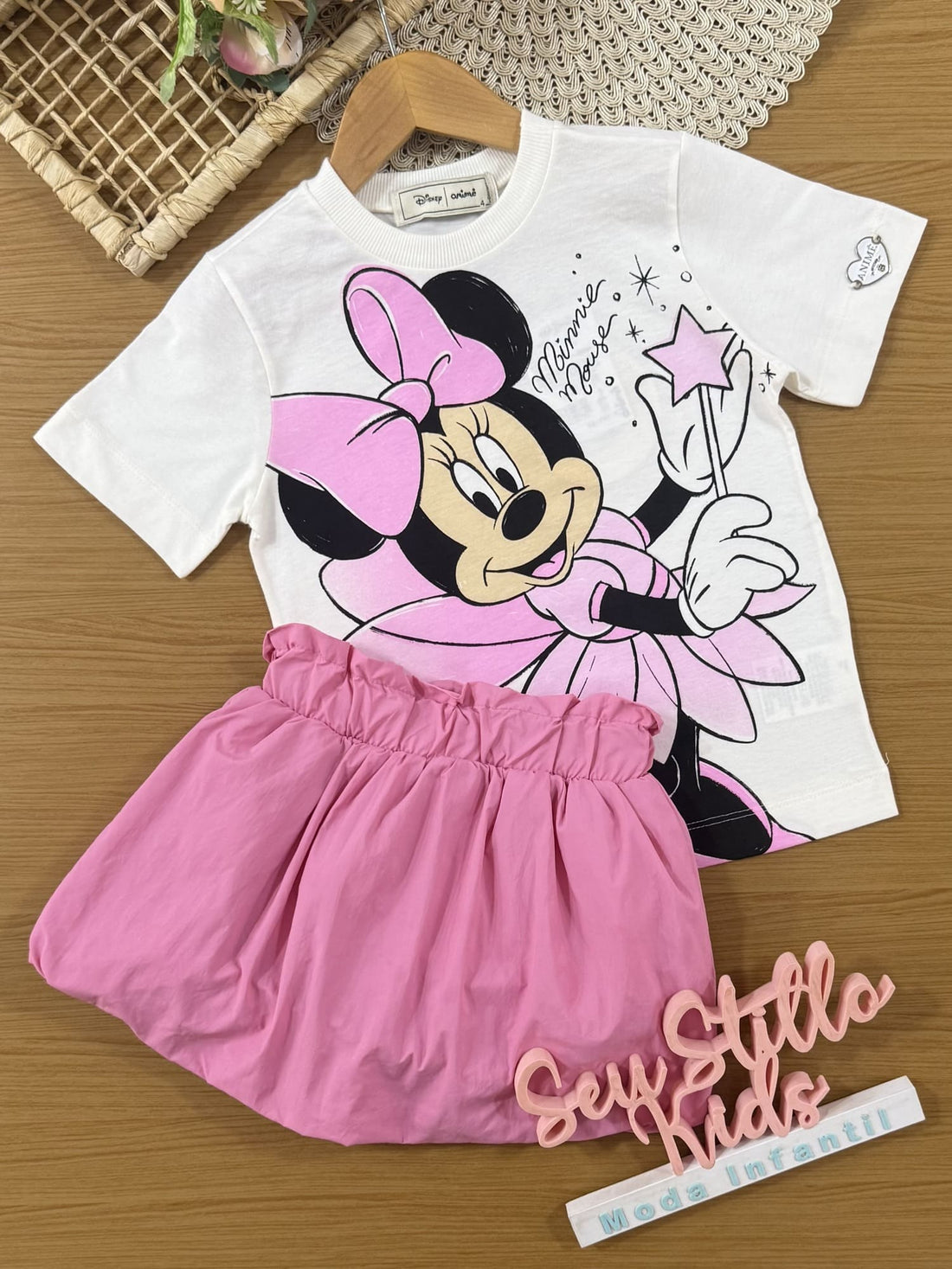 Conjunto Infantil Animê Verão com Saia Balone Rosa e Blusa Branca Minnie Fadinha Disney