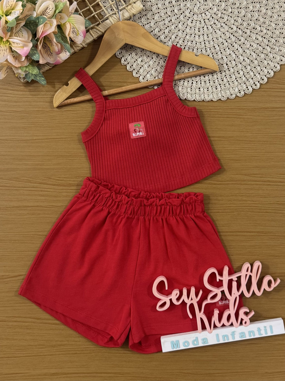 Conjunto Infantil Bimbi Verão com Shorts e Regata Vermelha Cerejinha