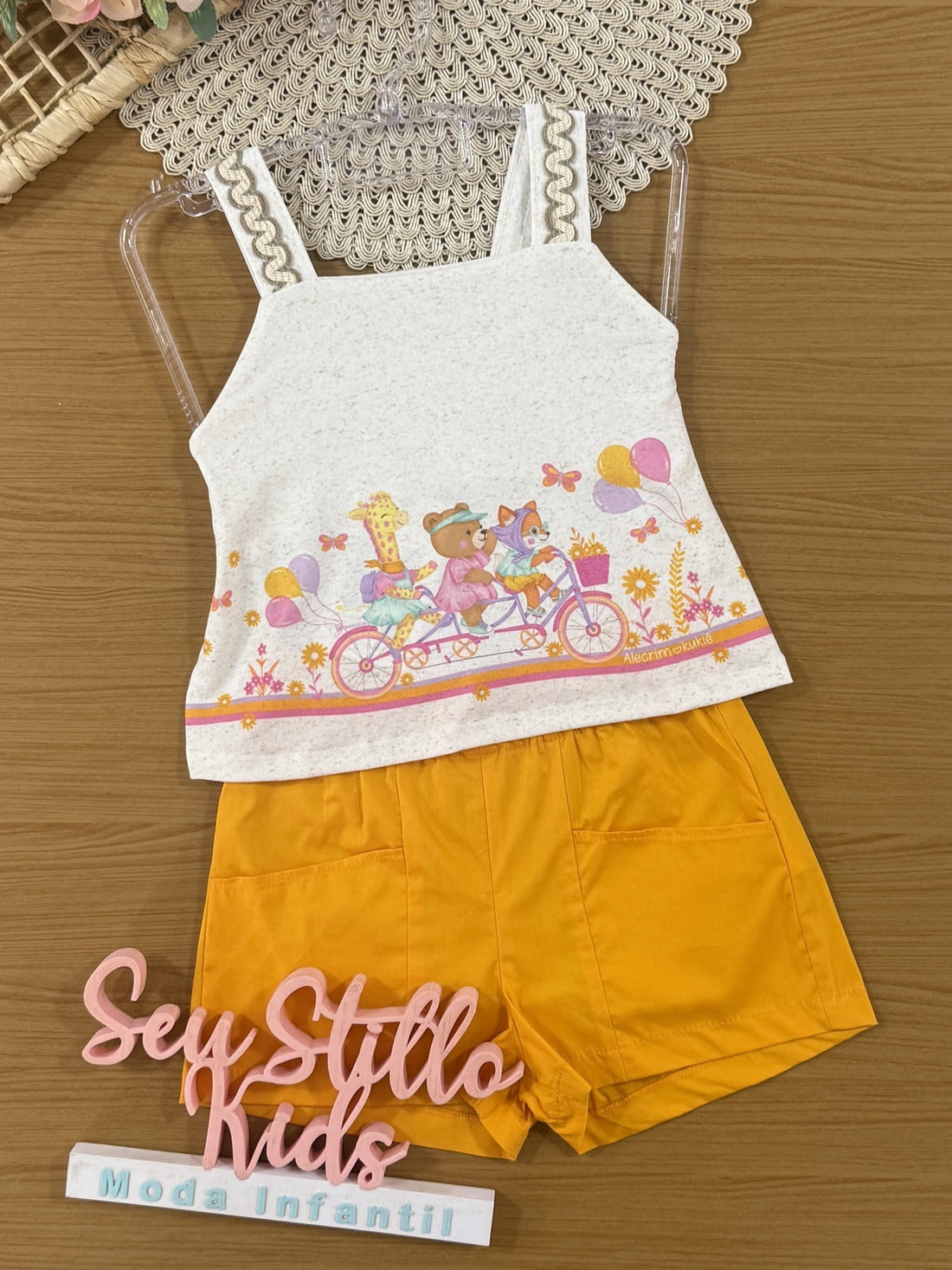 Conjunto Infantil Kukiê Verão com Shorts Laranja e Blusa Off White Bichinhos Passeio