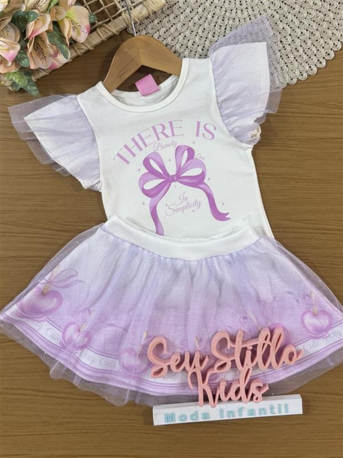 Conjunto Infantil Cinti Verão com Saia em Tule Lilás e Blusa Branca Lacinho