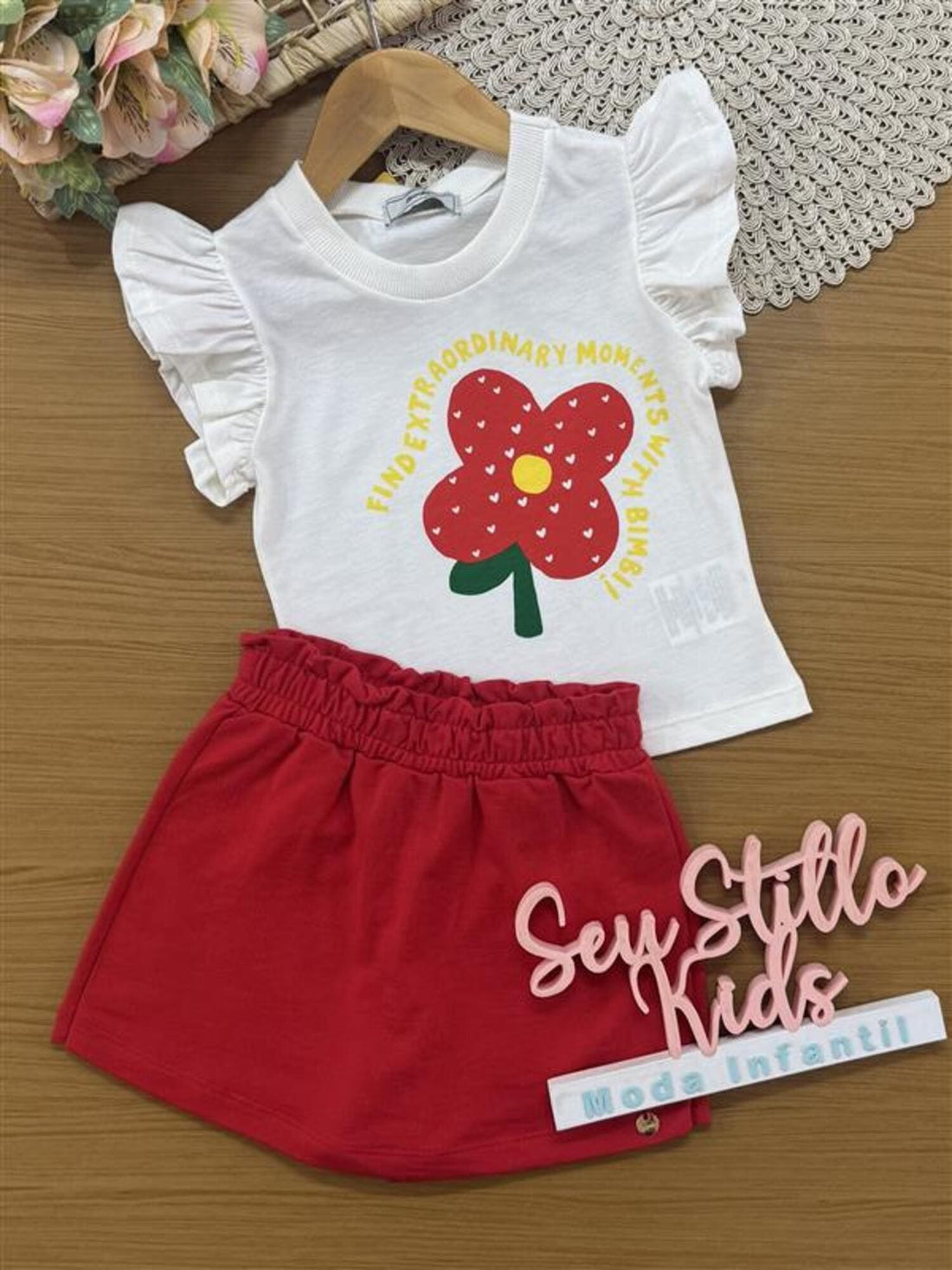 Conjunto Infantil Bimbi Verão com Shorts Saia Vermelho e Blusa Branca Florzinha