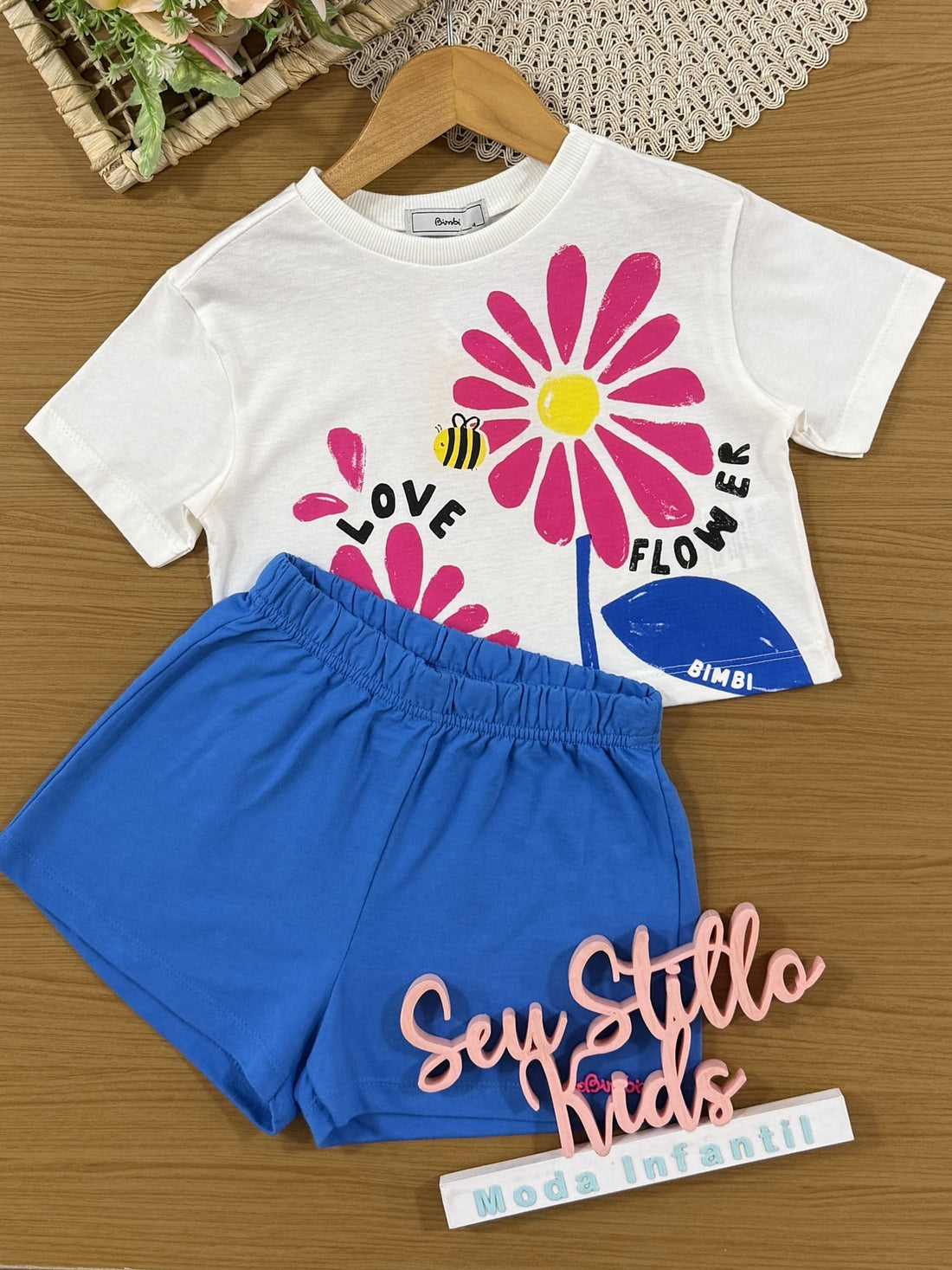 Conjunto Infantil Bimbi Verão com Shorts Azul e Blusa Branca Love Flower