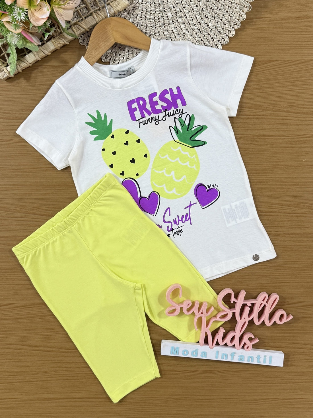 Conjunto Infantil Bimbi Verão com Shorts Ciclista Amarelo e Blusa Branca Abacaxi