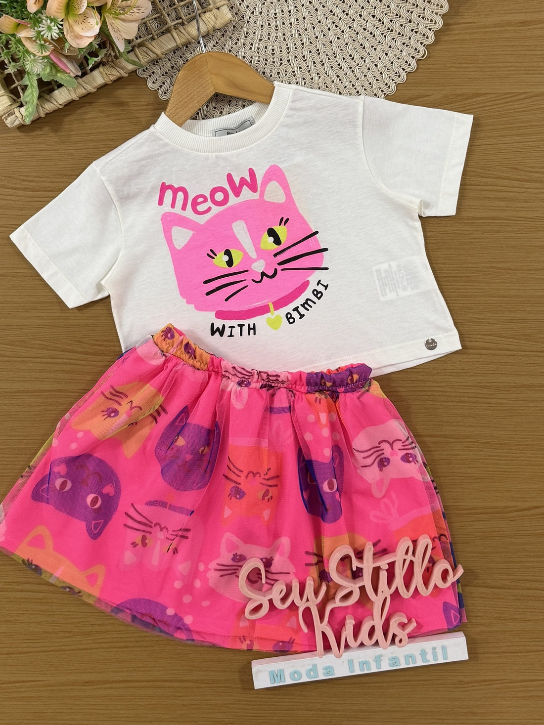 Conjunto Infantil Bimbi Verão com Saia Rosa e Blusa Branca Gatinha